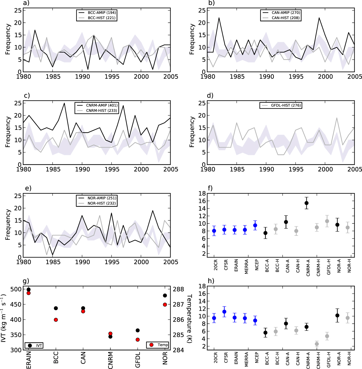Figure 2. Time series of winter AR totals in the Historical (grey lines) and AMIP (black lines) runs in the (a) bcc-csm1-1 model, (b) CanESM2/AM4 model, (c) CNRM-CM5 model, (d) GFDL-ESM2G model, and (e) NorESM1-M model. The light blue shading represents the range of AR totals in the five reanalyses (20CR, CFSR, ERAIN, MERRA and NCEP–NCAR). Panel (f) contains the average number of ARs per winter (using a model-dependent IVT threshold) with the corresponding 2.5th–97.5th sampling confidence intervals (reanalyses are in blue). Panel (g) shows the average winter 2 m surface temperature (red points; right y-axis) over the North Atlantic region (20° N–60° N; 60° W–0°) and the IVT threshold (black points; left y-axis) from 1980 to 2005 for the CMIP5 models and ERAIN, and panel (h) shows the average number of ARs per winter (using a fixed IVT threshold) with the corresponding 2.5th–97.5th sampling confidence intervals (reanalyses are in blue).