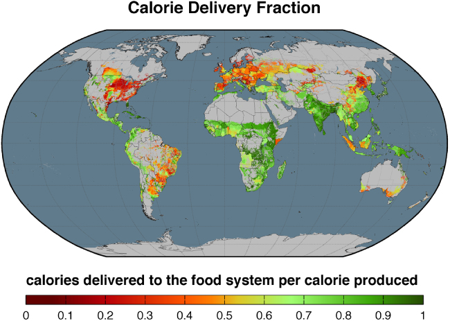 Figure 1. Calorie delivery fraction per hectare. The proportions of produced calories that are delivered as food are shown.