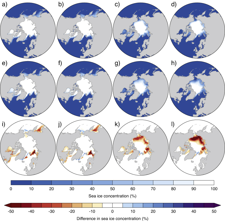 Figure 2. (a)–(d) Sea ice concentrations (%) in the high ice run for winter (December–January–February), spring (March–April–May), summer (June–July–August) and autumn (September–October–November), respectively. (e)–(h) As (a)–(d), but for the low ice run. (i)–(l) Sea ice concentration differences (%) between the low ice and high ice runs (low ice minus high ice) for the four seasons, respectively. Note the inverse colour scale.