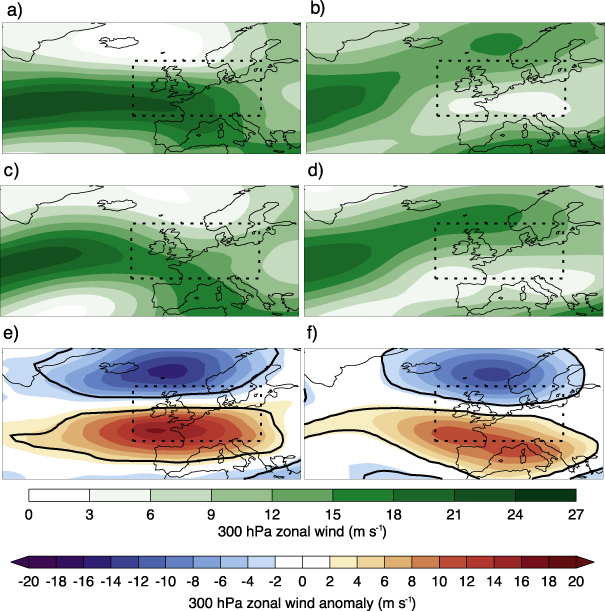 Figure 3. (a) Observed 300 hPa zonal wind (m s−1) averaged over the 10% wettest summer months over northern Europe (15° W–20° E, 45–60° N; shown by dashed box). (b) As (a), but for the 10% driest summer months over northern Europe. ((c), (d)) As ((a), (b)), but for the simulations. ((e), (f)) Differences between (a) and (b), and between (c) and (d), respectively. Black contours show the p = 0.1 statistical significance level.