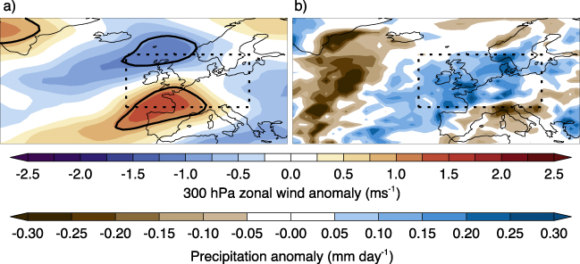 Figure 4. (a) Observed 300 hPa meridional wind anomalies (m s−1) during the 10% wettest summer months over northern Europe (15° W–20° E, 45–60° N; shown by dashed box) relative to the 10% driest summer months over northern Europe. The black contours show the p = 0.1 statistical significance level. (b) As (a), but for the simulations.