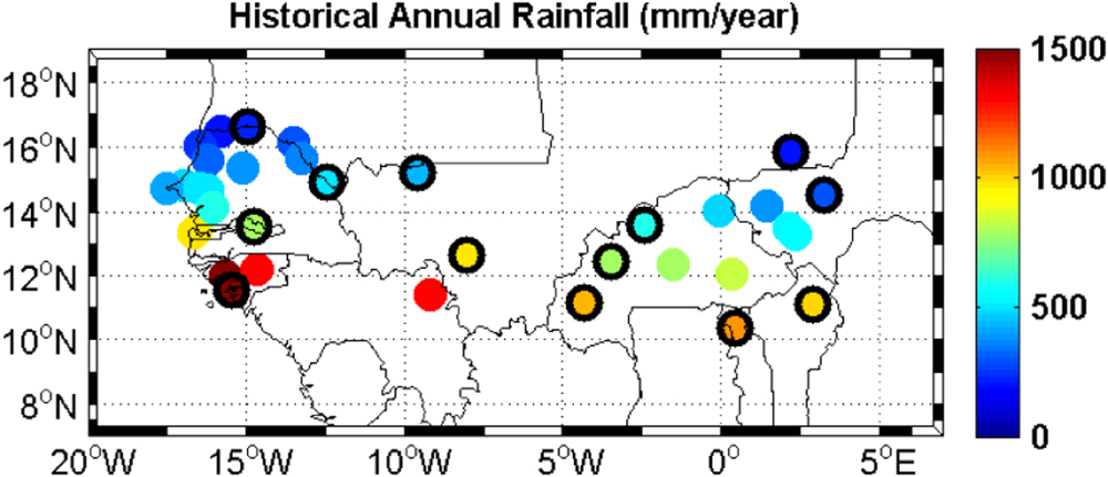 Figure 1. Map of West Africa and location of stations. Total rainfall amount (mm/year) in average over the reference period 1961–1990. Thick circles show the localization of the 13 stations used for climate change impacts scenarios.