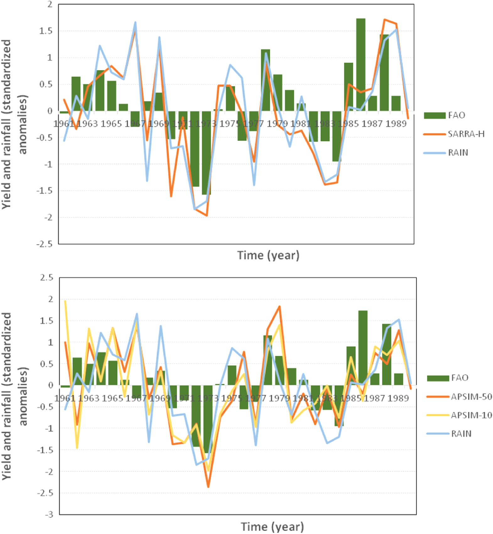 Since sorting out climatic and non-climatic trends in yield is not possible, detrending might also remove potential climate effects. In such a case, climate trends would force the simulated yields to show a trend as well. Therefore, the only way to make a comparison between observations and simulations fair is to detrend both. Thus we also remove the linear trend from simulated yield time series. The linear trend equation for crop models outputs are (i) yield = −38.2*year + 2839; yield = −28.7*year + 3323 for the APSIM simulations with a fertilization rate of respectively 10 kg ha−1 and 50 kg ha−1; and (ii) yield = −15.8*year + 2026 for the SARRA-H crop model. The strong declining trends in the APSIM crop yields are due to the soil fertility loss since there was no resetting of mineral inputs after the start of the simulation.