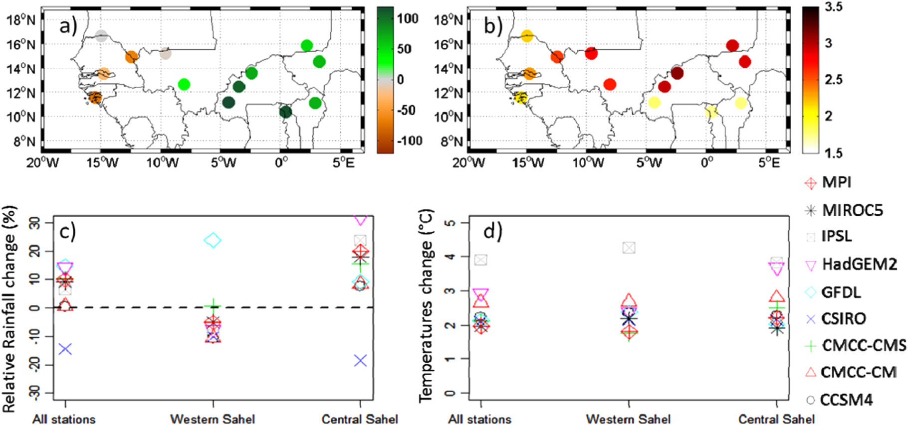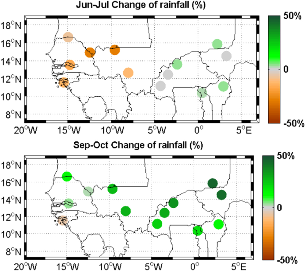 Figure 4 shows the annual rainfall (figure 4 (a)) and the mean surface temperature (figure 4(b)) changes under the scenario RCP8.5 for the 2031–2060 period. The changes are computed as averages across the nine GCM simulations for each of the 13 stations. Future changes in rainfall clearly depict a West-East dipole with annual rainfall increasing in eight stations located in Central Sahel while rainfall is stagnating or decreasing in stations located in the Western part of the Sahel. The rainfall increase can reach +100% in two Southern stations located in Burkina Faso and Ghana. Regional mean rainfall changes for the full set of stations and subsets in the Western and Central Sahel are shown for each individual GCM in figure 4(c). The dipole pattern is a very consistent feature across GCM simulations with 7 out of 9 GCM simulating less rainfall in the future in the Western Sahel and 8 out of 9 GCM showing a rainfall increase in Central Sahel. Although the precise location of the separation line in the dipole varies, a similar rainfall response in the Sahel is found in several studies using different subsets of CMIP5 models (Monerie et al 2012, 2013, Biasutti 2013) and CMIP3 models (Biasutti and Sobel 2009, Fontaine et al 2011, Monerie et al 2013), different emission scenarios, and different periods (typically looking further out in the future). Figure 5 shows that the rainfall deficit is essentially concentrated in early monsoon season in the Western part of the Sahel in June–July (figure 5(a)) while positive rainfall changes are found in late monsoon season all over the Sahel in September–October (figure 5(b)). It suggests a shift in the seasonality of the monsoon which may start later in the Western part of the Sahel and become more active in fall especially in Central Sahel. This change in seasonality is also very consistent with previous studies using completely different sets of GCM simulations from the CMIP3 (Biasutti and Sobel 2009) and the CMIP5 (Biasutti 2013).