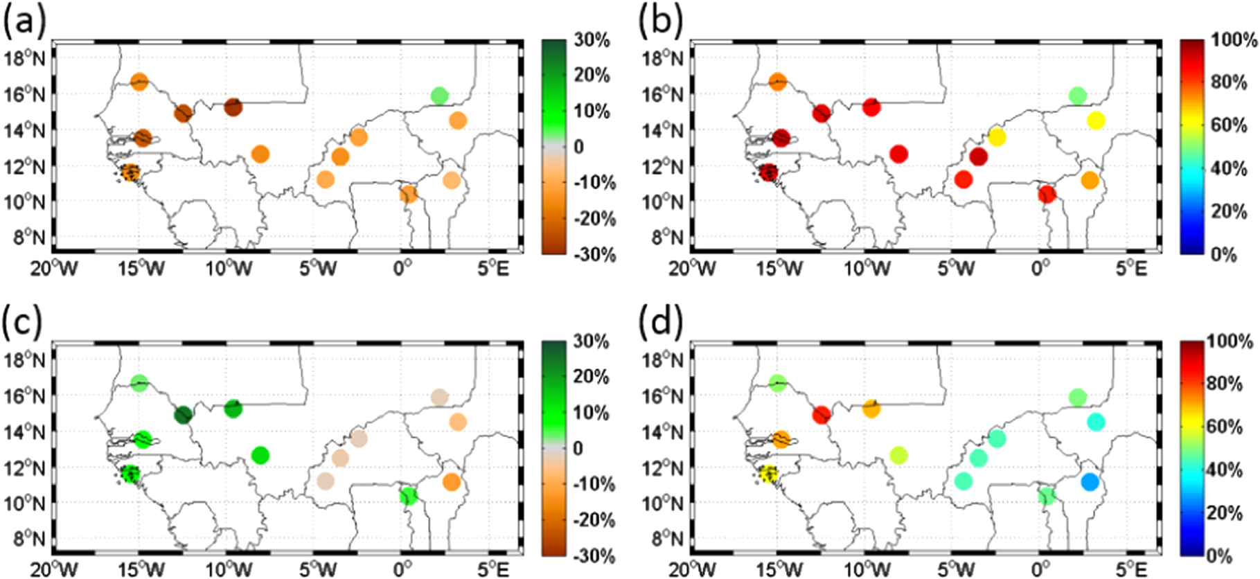 Figure 6. Simulated changes in mean yield and variability under the RCP8.5 scenario. Left panel: relative changes (%) between the periods 2031–2060 and 1961–1990 in mean yield of sorghum (a) and in coefficient of variation of yields (c). Simulated yields are mean yields from the two crop models and the three varieties of sorghum. Right panel: agreement across all model simulations (in %) in the decrease of mean yield (b) and the increase of the coefficient of variation (d) in the 2031–2060 period. This agreement is computed using the nine GCMs, the two crop models and the three varieties of sorghum. In both panels, a weight of ¼ has been given to the two APSIM runs (10 kg ha−1 and 50 kg ha−1) and a weight of ½ to the SARRA-H runs to avoid oversampling of the APSIM simulations.