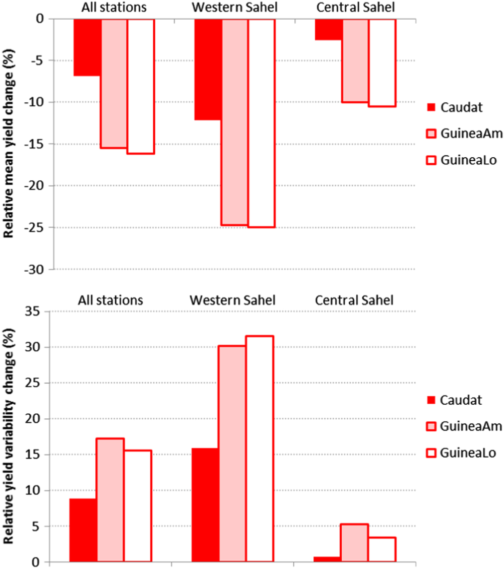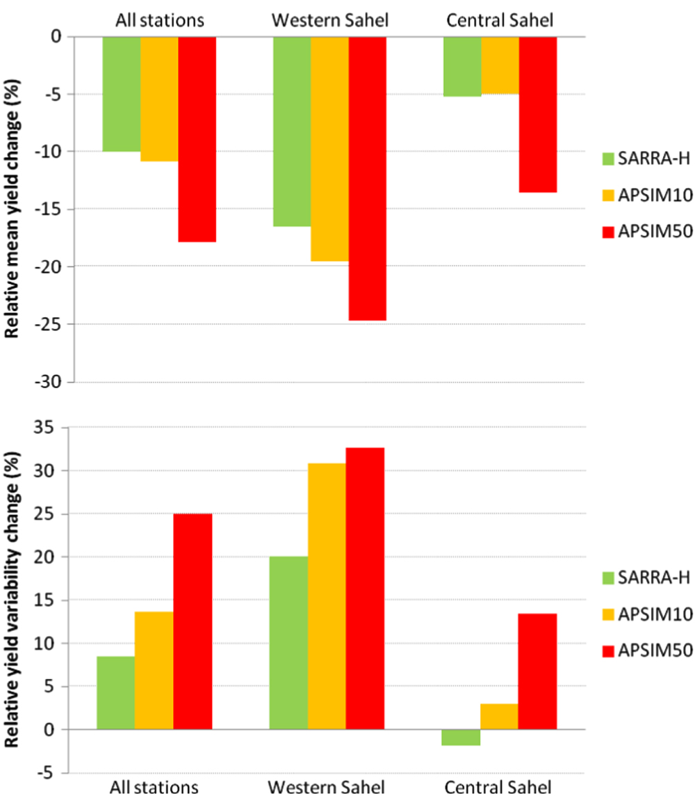 Figure 7. Simulated changes in mean yield and variability across Sahel. Upper panel: relative changes (%) between the periods 2031–2060 and 1961–1990 in mean yield of sorghum in average across the 9 GCM simulations and the three varieties of sorghum. The relative changes are computed on average across the 13 stations (all stations), across the 6 western stations (Western Sahel) and across the 6 eastern stations (Central Sahel). Bottom panel: same but for the relative change in the coefficient of variation.