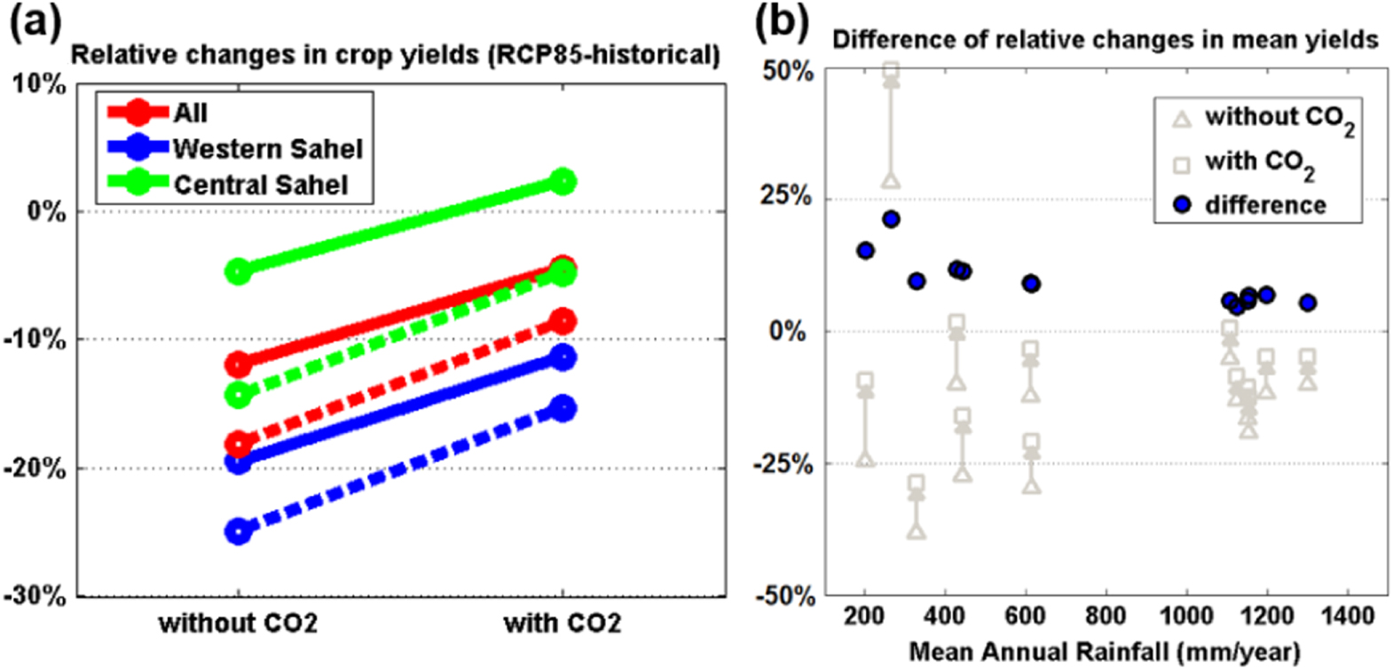 Figure 9. Effects of CO2 on climate change impacts on crop yields. (a) Effects of CO2 on relative changes (%) in mean crop yields. The solid and dashed lines refer to 10 kg ha−1 and 50 kg ha−1 fertilizer inputs. The results are averaged over all GCM model ensembles and three crop cultivars. (b) Station-level relative yield changes (%) averaged over both nutrient levels with or without CO2 effects, and also the benefits of CO2 fertilization in terms of relative changes in crop yields, as a function of mean annual precipitation (mm/year).