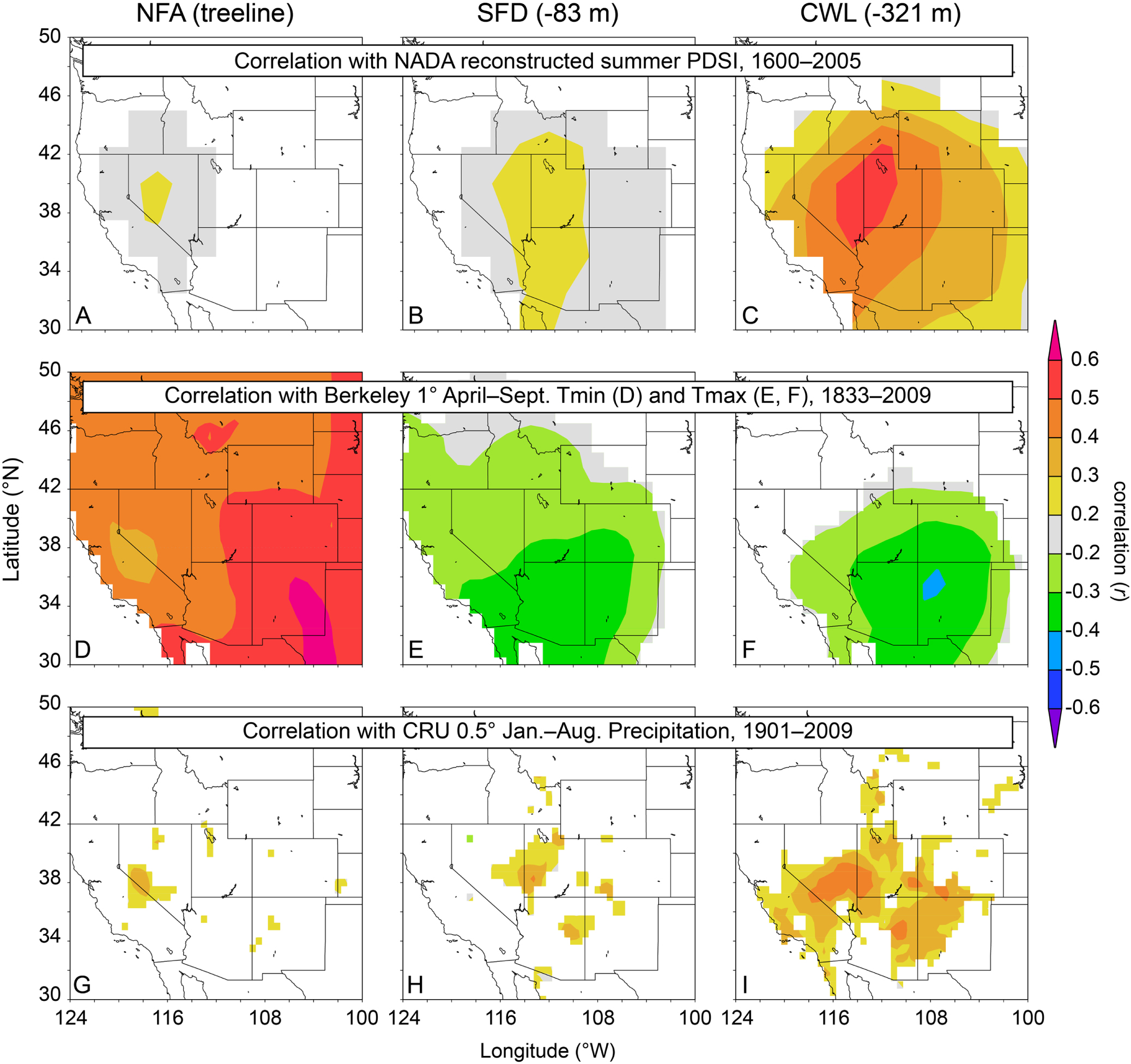 Figure 3. Correlation of three of the tree-ring chronologies used in this study with spatial fields of climatic variables from KNMI Climate Explorer (Trouet and Oldenborgh 2013). Chronologies are correlated with reconstructed summer PDSI (A)–(C) (Cook et al 2004) (1600–2005), with instrumental warm-season temperature (D)–(F) (http://berkeleyearth.org/data/) (1833–2009), and with CRU TS3.21 cool-season precipitation (G)–(I) (Harris et al 2014) (1901–2009).