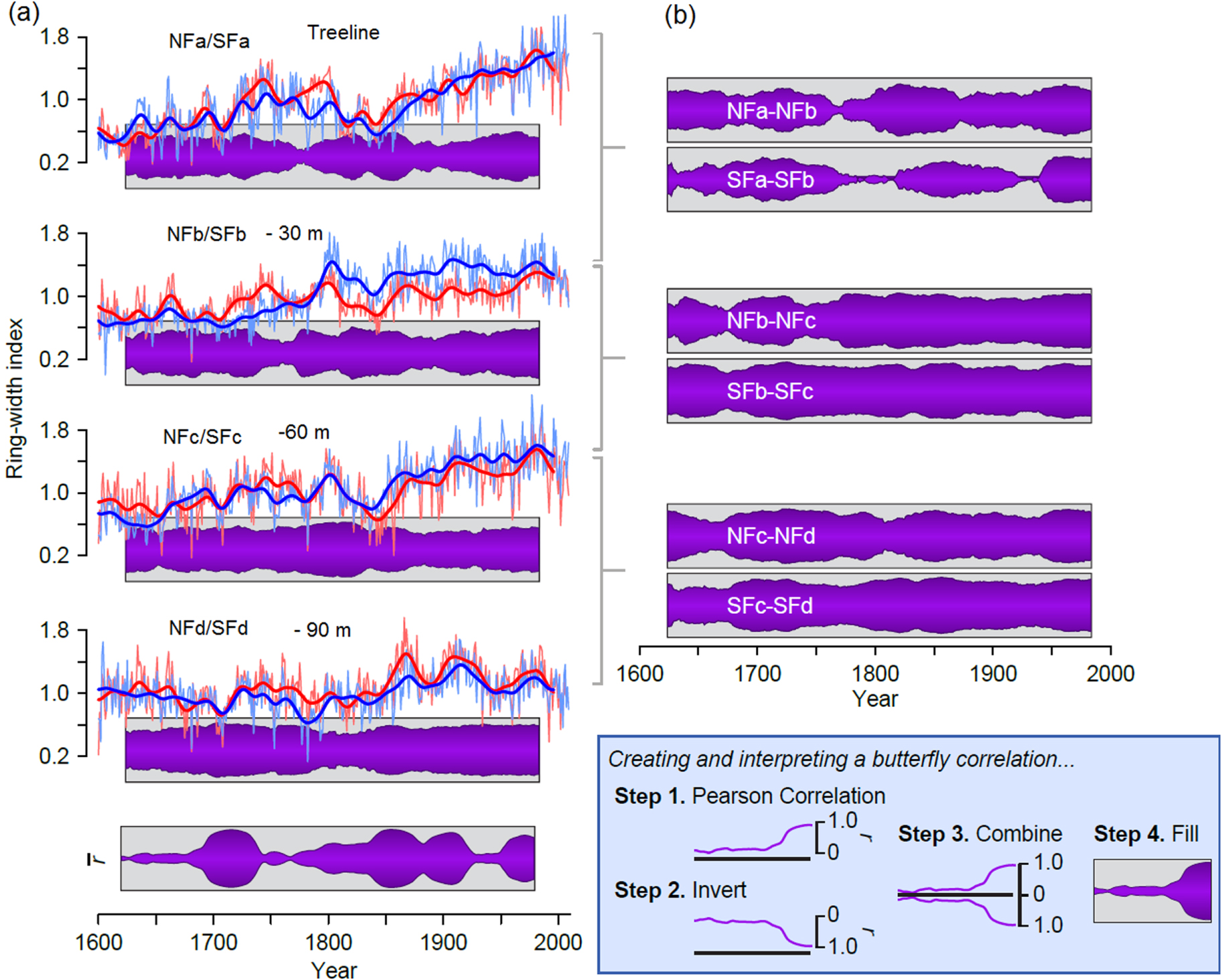 Standard image High-resolution imageThe c and d paired chronologies show less century-scale trend than the treeline chronologies and greater agreement over time and across aspects. For example, the butterfly correlations (figure 6(B)) are consistently high for the NFc/SFc and NFd/SFd comparisons. This agreement across aspect, along with nearly the same growth rates (figure 4) suggests that the trees at these elevations are consistently responding to the same environmental forcing(s).