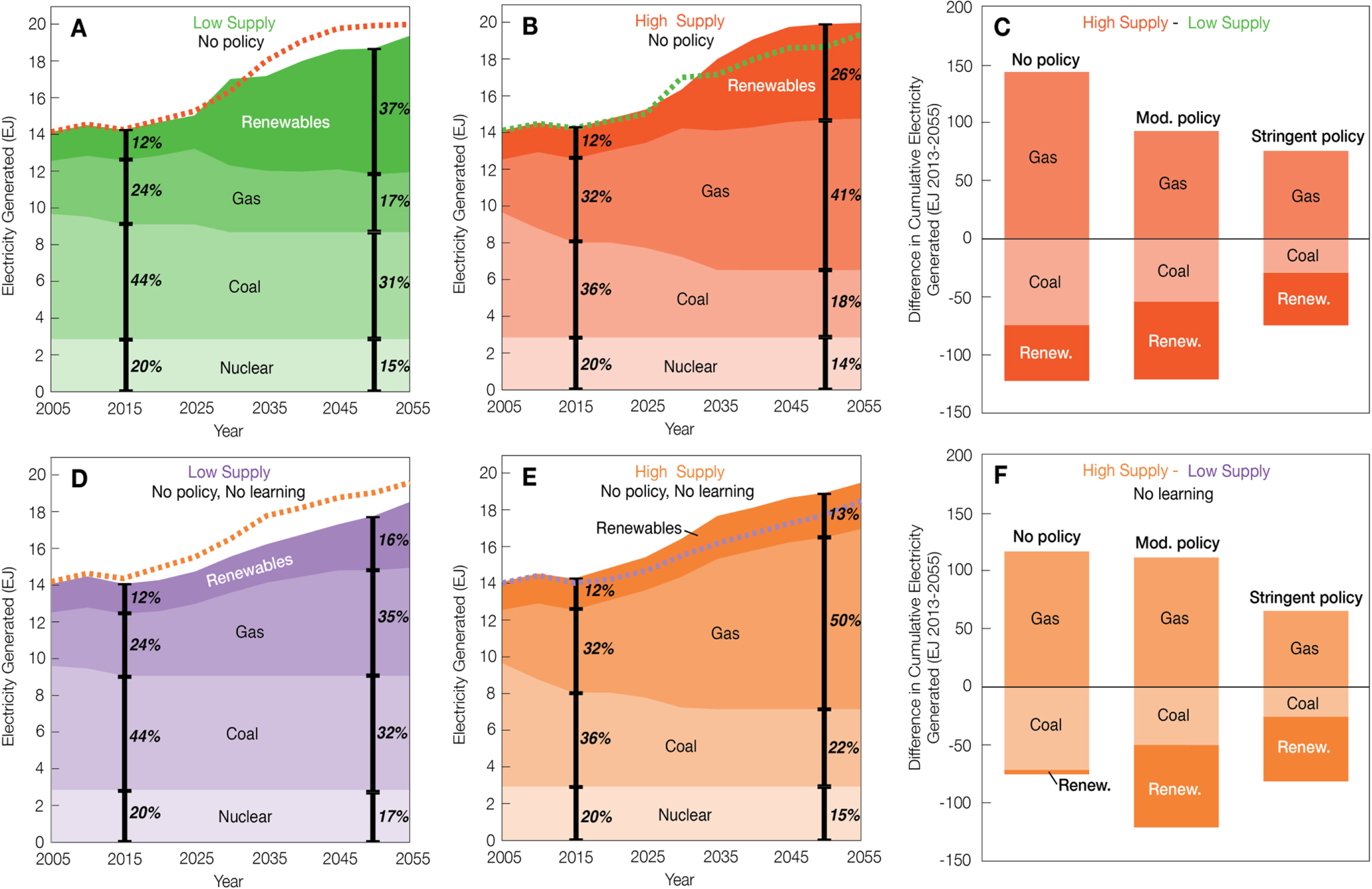 Figure 2. Higher natural gas supplies lead to increased use of gas for electricity generation at the expense of both coal and renewables. Under the low gas supply scenario and assuming no new climate policies, renewables provide 37% of all electricity in 2050 (A), while under the high gas supply scenario (B), renewables provide 26%. The dashed lines show total electricity consumption for low and high gas supply; electricity generation is somewhat higher when gas is more abundant. Across a range of climate policies, high gas leads to large increases in electricity from gas, and significant decreases in both coal and renewables (C). Compared to a scenario without the 20% learning rate for solar, there is little growth in renewable electricity under no climate policy for both low (D) and high gas supply (E), and less renewable electricity and coal for high gas supply across the climate policies (F).