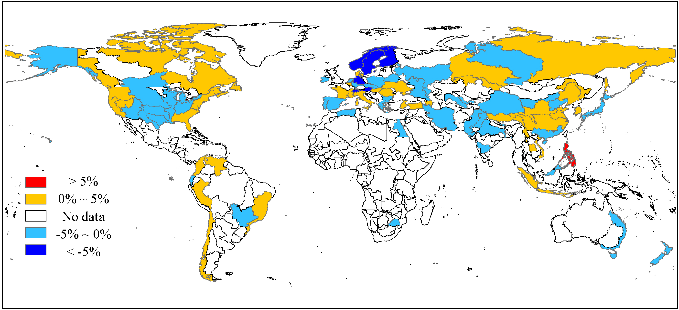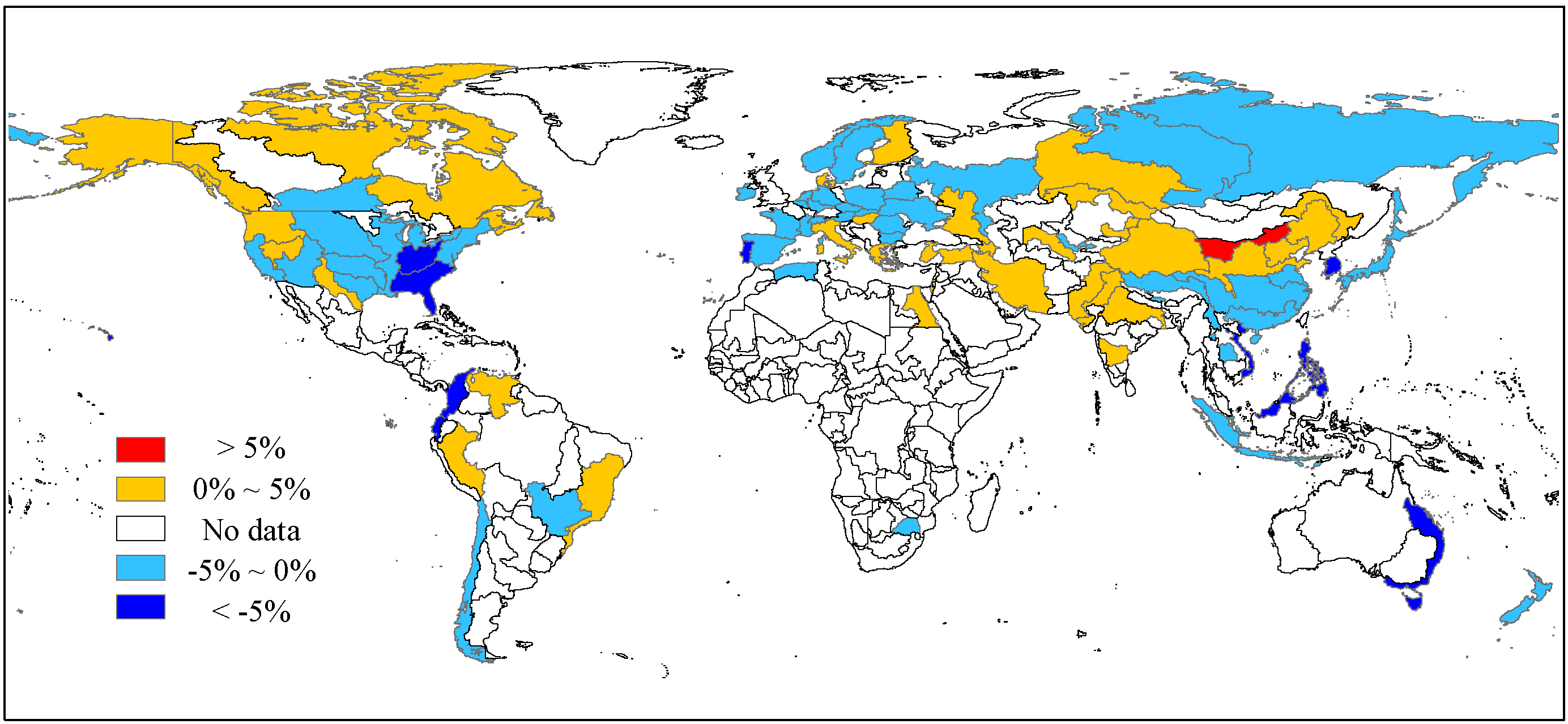 The sensitivity of hydroelectricity generation to precipitation is shown in figure 3. FPUs with positive sensitivity values, such as those in Northern China, India, Central Asia and Canada, (i.e. in red and yellow color) indicate that hydroelectricity generation will be larger under increased precipitation. This means that current hydropower capacity in these FPUs is possibly constrained by water availability and greater precipitation may increase hydroelectricity generation with existing facilities. FPUs with negative sensitivity values, that is, where hydroelectricity generation will be lower with increased precipitation, are located in most basins in the U.S., Southern China, and most basins in Europe and Oceania, as shown in blue color in figure 3. In these cases, hydropower production can decline by more than 5%, such as in the East Coast of Australia, parts of Southeast Asia, South Korea and parts of the Southeastern U.S. Since these FPUs generally have abundant rainfall which may result in high streamflow and thus flooding, a possible explanation for the reduced hydroelectricity generation is that flood control purposes of the reservoirs in these FPUs constrain hydropower generation. During the flooding season, reservoir storage is held below a certain level so that sufficient storage is reserved for receiving flood waters during a storm. The decreased hydraulic head can lead to losses in hydroelectricity generation during increased precipitation and preparations for potential flooding.