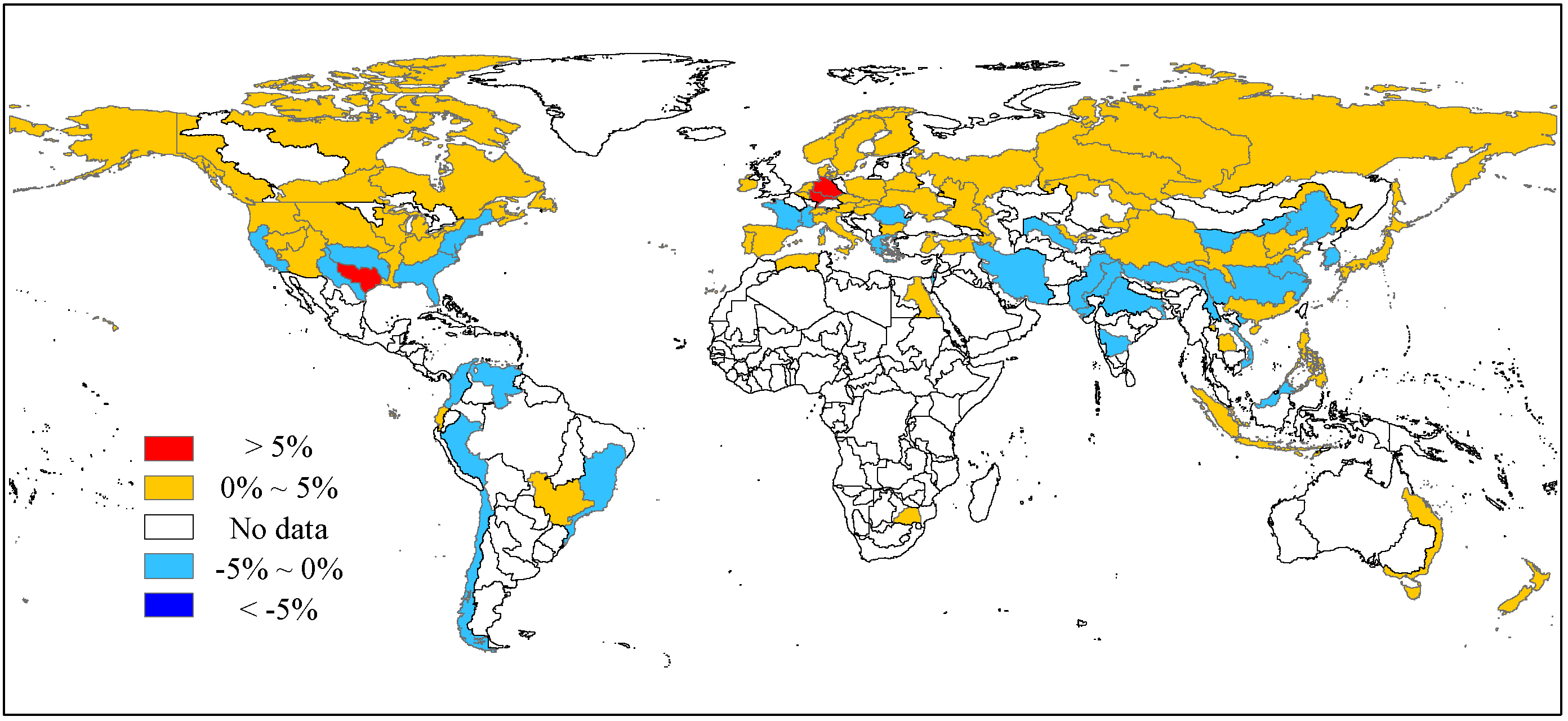 Figure 2 The sensitivity of hydropower generation to irrigation (percentage change of mean hydropower generation corresponding to one standard deviation change of irrigation water use in each FPU).