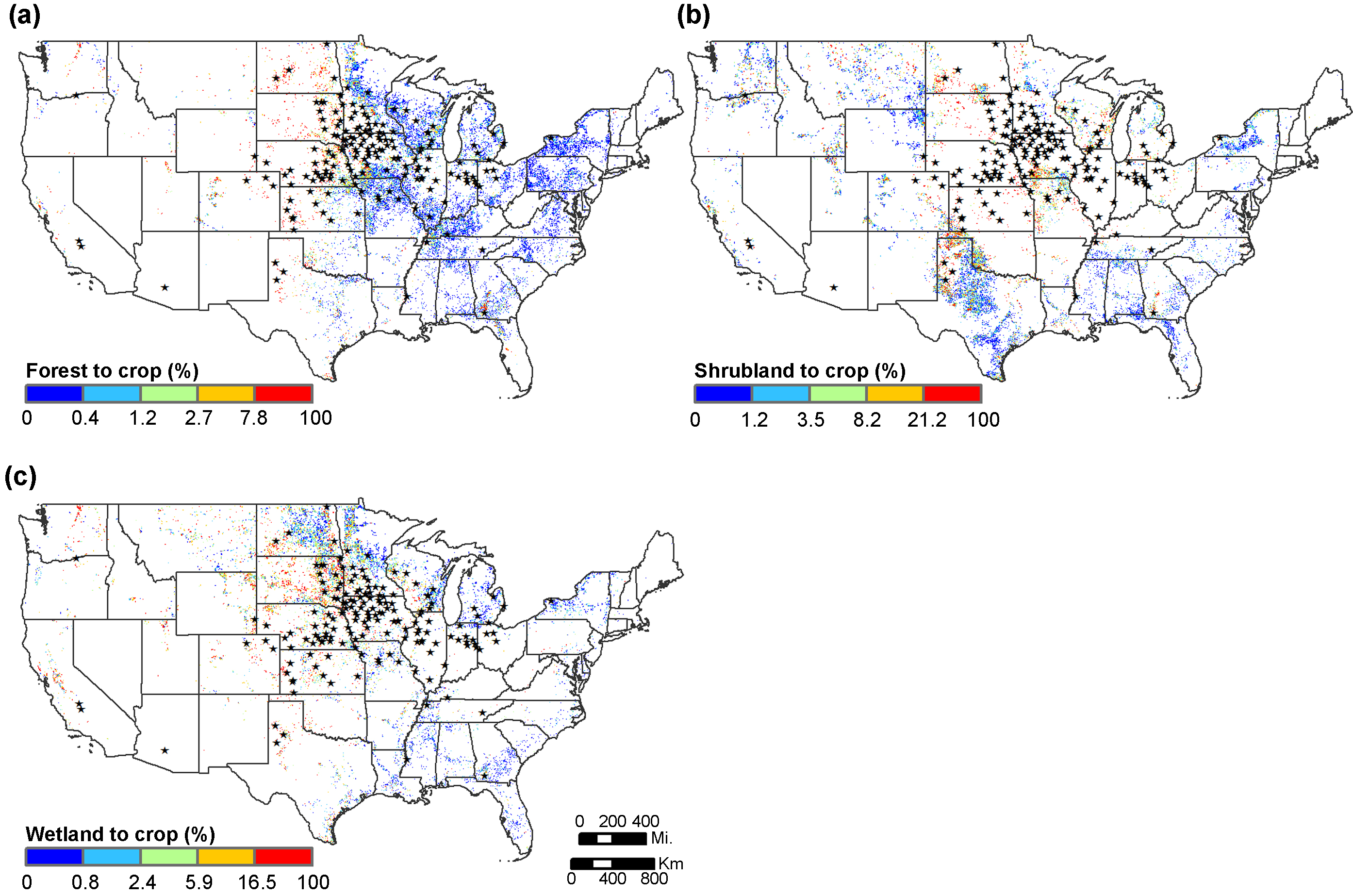 Figure 10 Relative conversion rates of arable non-cropland to cropland (2008–2012) by generalized land cover class (normalized by area in each class in 2008). (a) Forest; (b) Shrubland; and (c) Wetland. Legend values are quintiles of non-zero rates. Spatial resolution 3.5 miles.