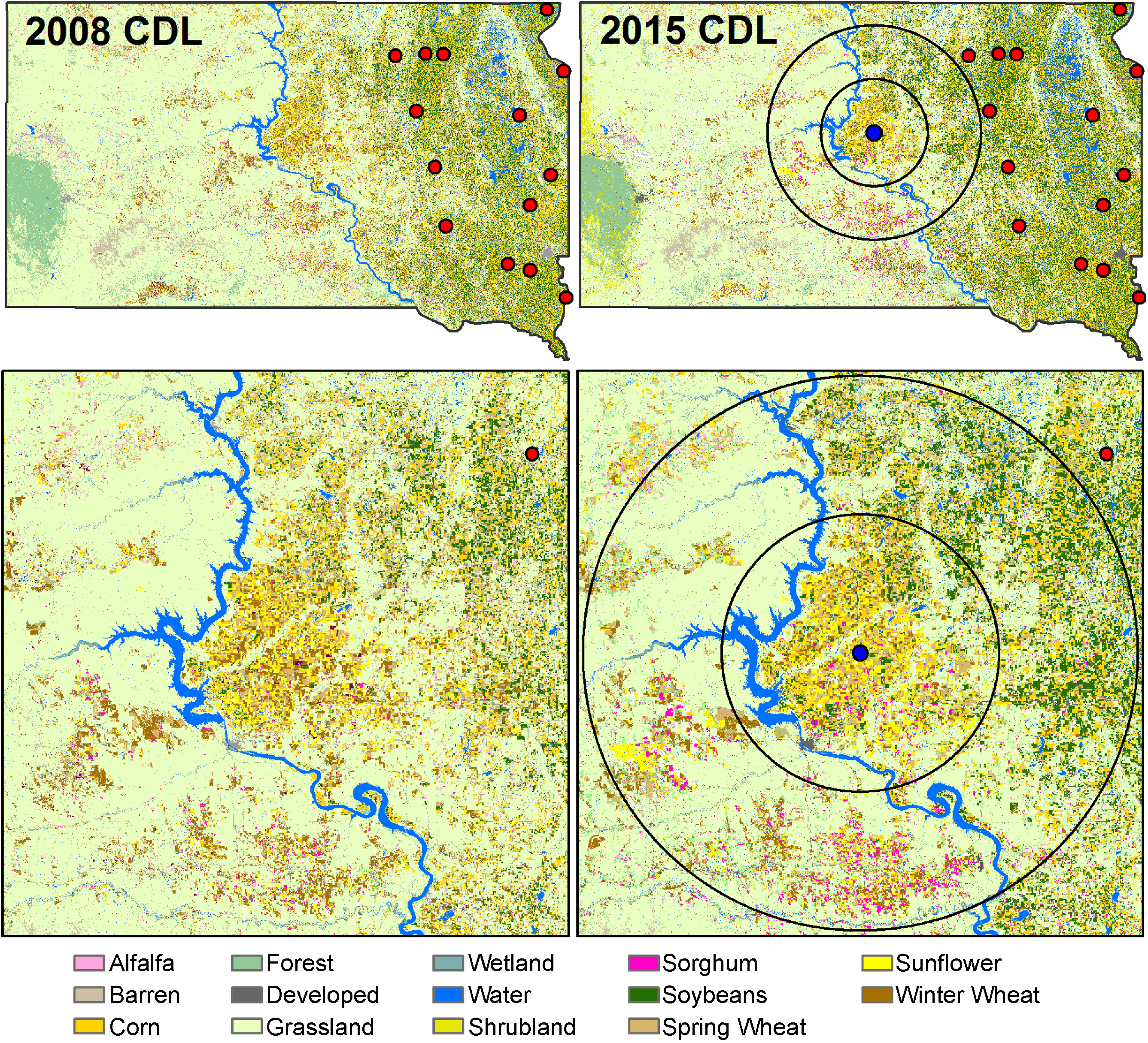 Figure 11 South Dakota land cover from the Cropland Data Layer (CDL) products for 2008 (left) and 2015 (right). Red circles are existing ethanol refineries. On the right, the blue circle marks an ethanol refinery under construction in Onida, South Dakota. Surrounding this location, larger black circles represent potential feedstock draw areas at 50- and 100 miles distance. Onida is located just east of the Missouri River (in blue), in a climatic transition zone between the mesic corn-growing region to the east and a semi-arid climate to the west. Primary crops in the Onida area include sunflower, wheat, corn, soybeans and sorghum.