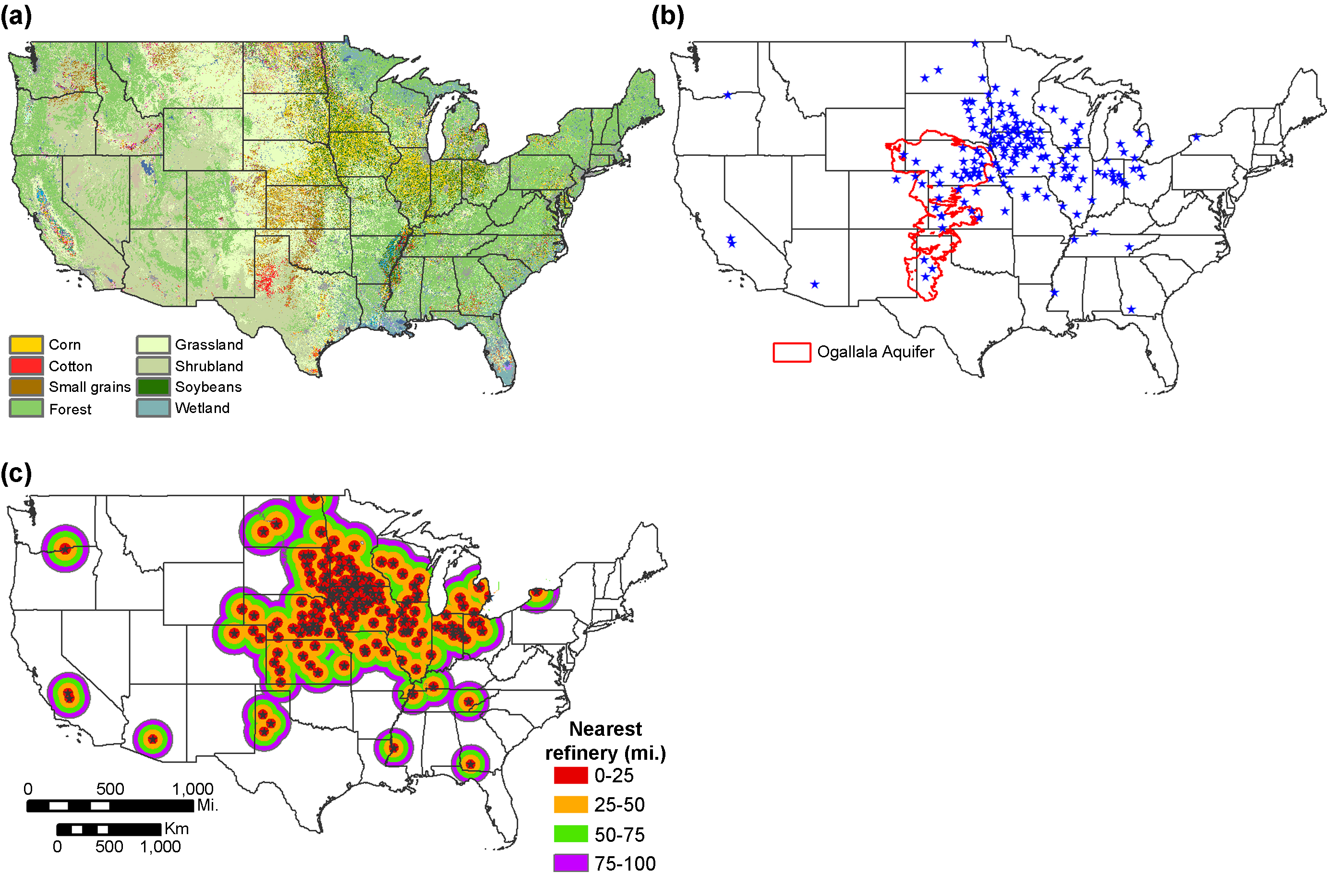 Figure 1 (a) U.S. land cover from the 2008 Cropland Data Layer. The Corn Belt occupies the north-central U.S. and is largely comprised of a mixture of corn (yellow) and soybean (dark green) cultivation. (b) Locations of refineries (blue stars) actively producing corn ethanol as of 2009 (n = 173). Outline of Ogallala Aquifer in red. (c) Concentric regions surrounding ethanol refineries at distances of 25, 50, 75, and 100 miles.