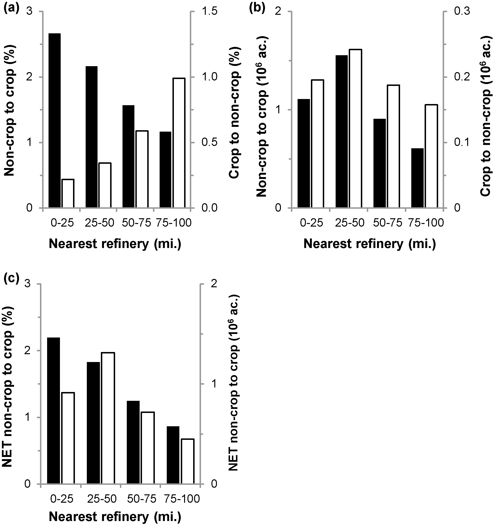Figure 2 Aggregate rates of change between arable non-cropland and cropland (2008–2012) plotted as a function of proximity to ethanol refineries. Distance intervals as in figure 1(c). (a) On the primary axis (black bars), relative conversion rates normalized by 2008 non-cropland area. On the secondary axis (white bars), relative rates of cropland reversion to non-cropland normalized by 2008 cropland area. (b) Gross conversion (primary axis, black bars) and reversion (secondary axis, white bars), both in 106 acres. (d) On the primary axis (black bars), net conversion (conversion minus reversion), normalized by 2008 non-cropland area. On secondary axis (white bars), net conversion in 106 acres.