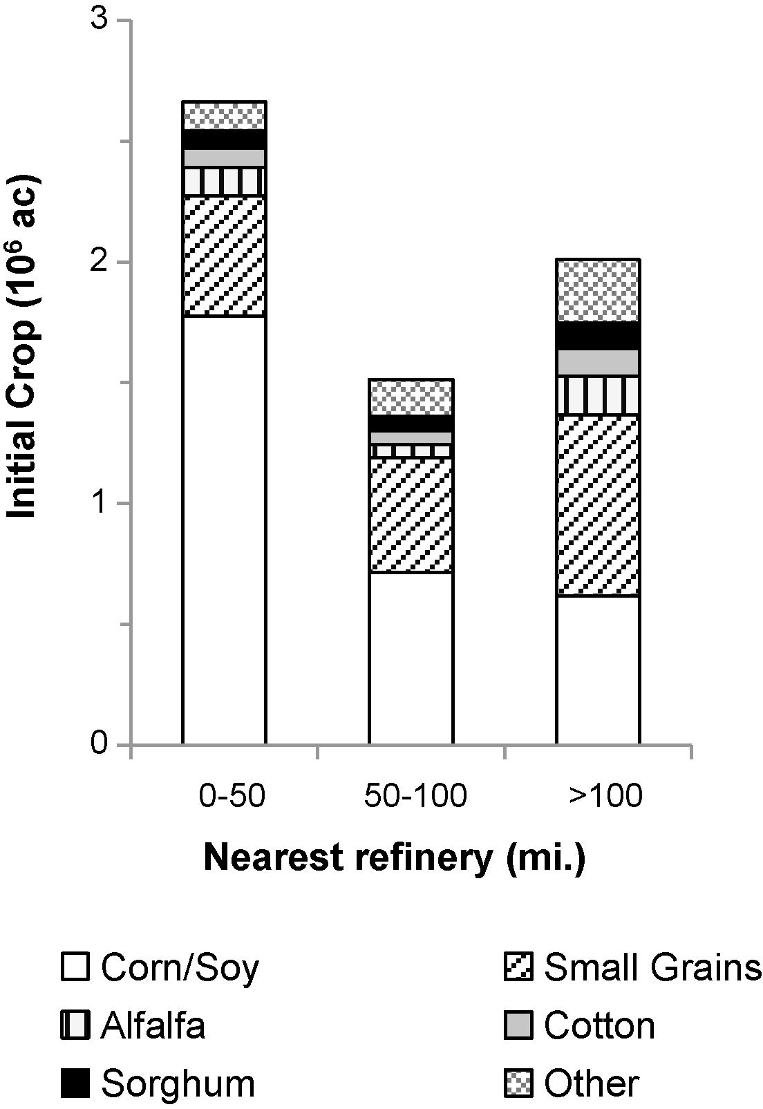 Figure 3 Initial crops following conversion of arable non-cropland to cropland as a function of proximity to ethanol refineries (in 106 acres).