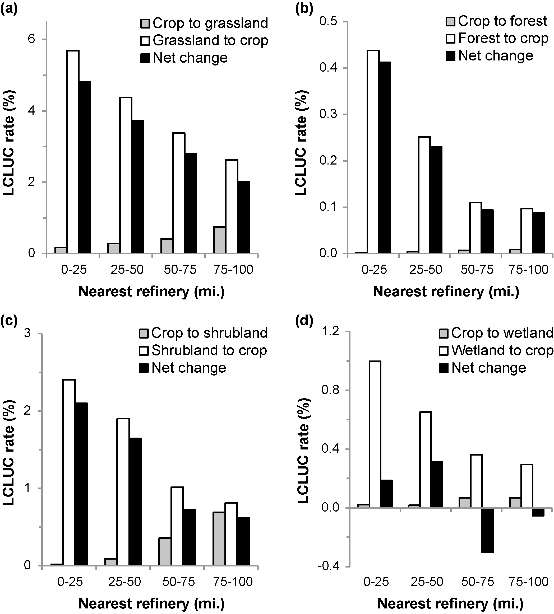 Figure 4 Relative LCLUC rates (2008–2012) as a function of generalized land cover class and proximity to ethanol refineries. Conversion and net change rates normalized by arable land in the applicable non-cropland class in 2008. Reversion rates normalized by cropland area in 2008.