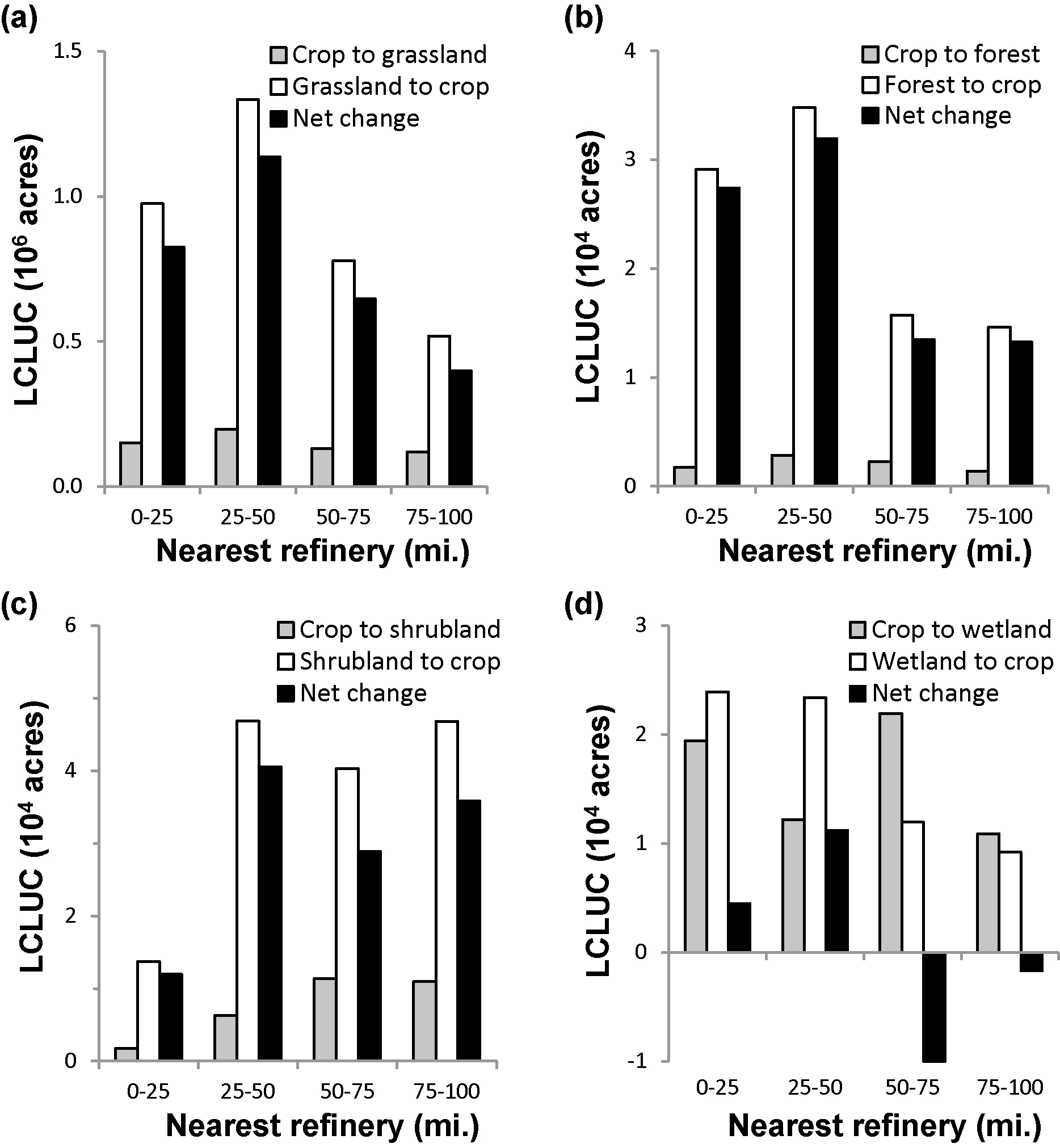 Standard image High-resolution imageFigure 5 Gross LCLUC (2008–2012) as a function of generalized land cover class and proximity to ethanol refineries. Note that grassland values are in 106 acres; forest, shrubland, and wetland in 104 acres. A positive net change (conversion minus reversion) represents a net loss in a given category; negative values indicate net gains (wetland only).