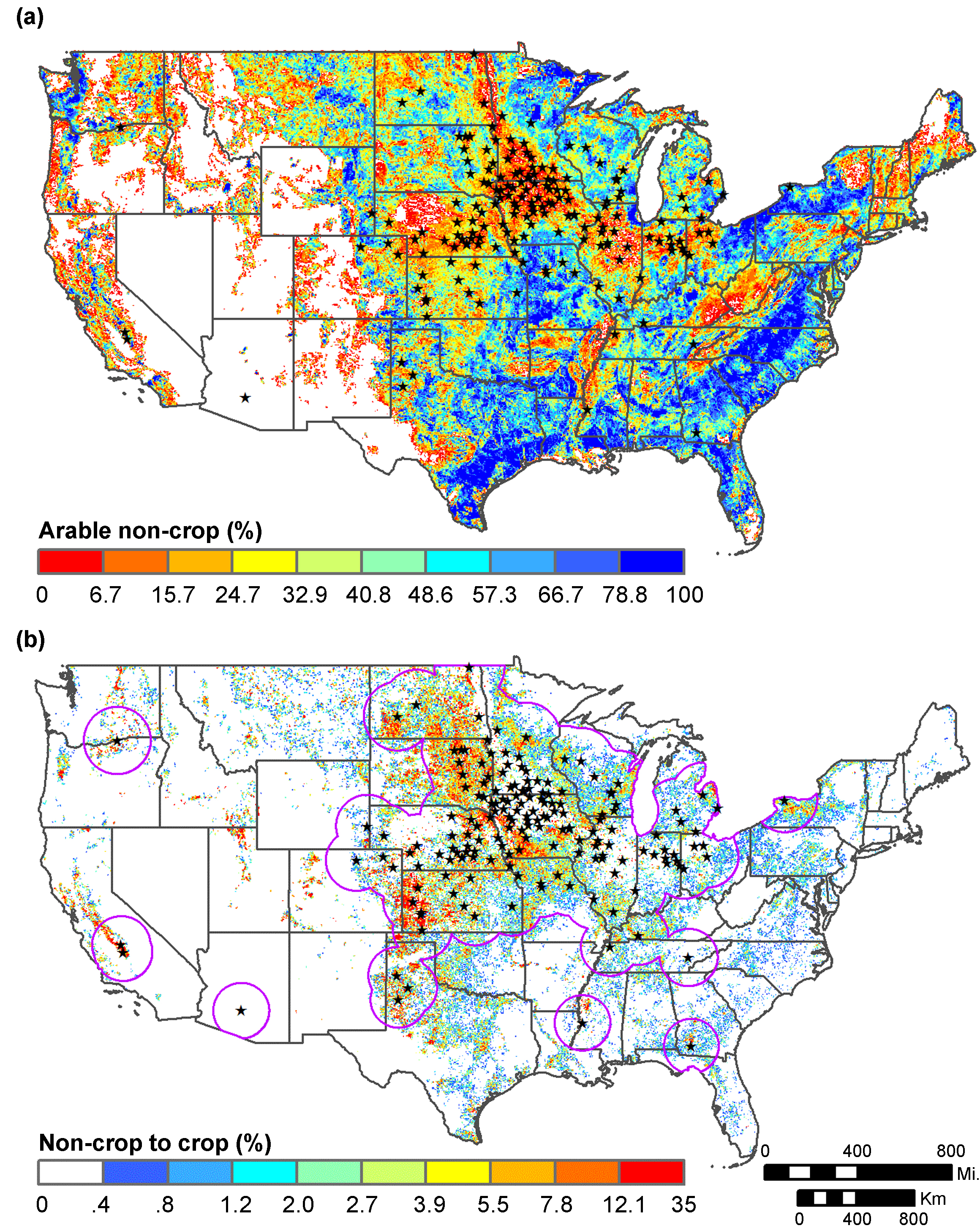 Figure 6 (a) Percent cover of arable non-cropland in 2008. Legend values are deciles of the cumulative distribution of non-zero rates; i.e. the 10th-, 20th-, 30th-...percentiles. (b) Relative conversion rates of arable non-cropland to cropland (2008−2012). Legend values are deciles of non-zero rates. Purple outline represents 100 mile, national draw area. Spatial resolution 3.5 miles.