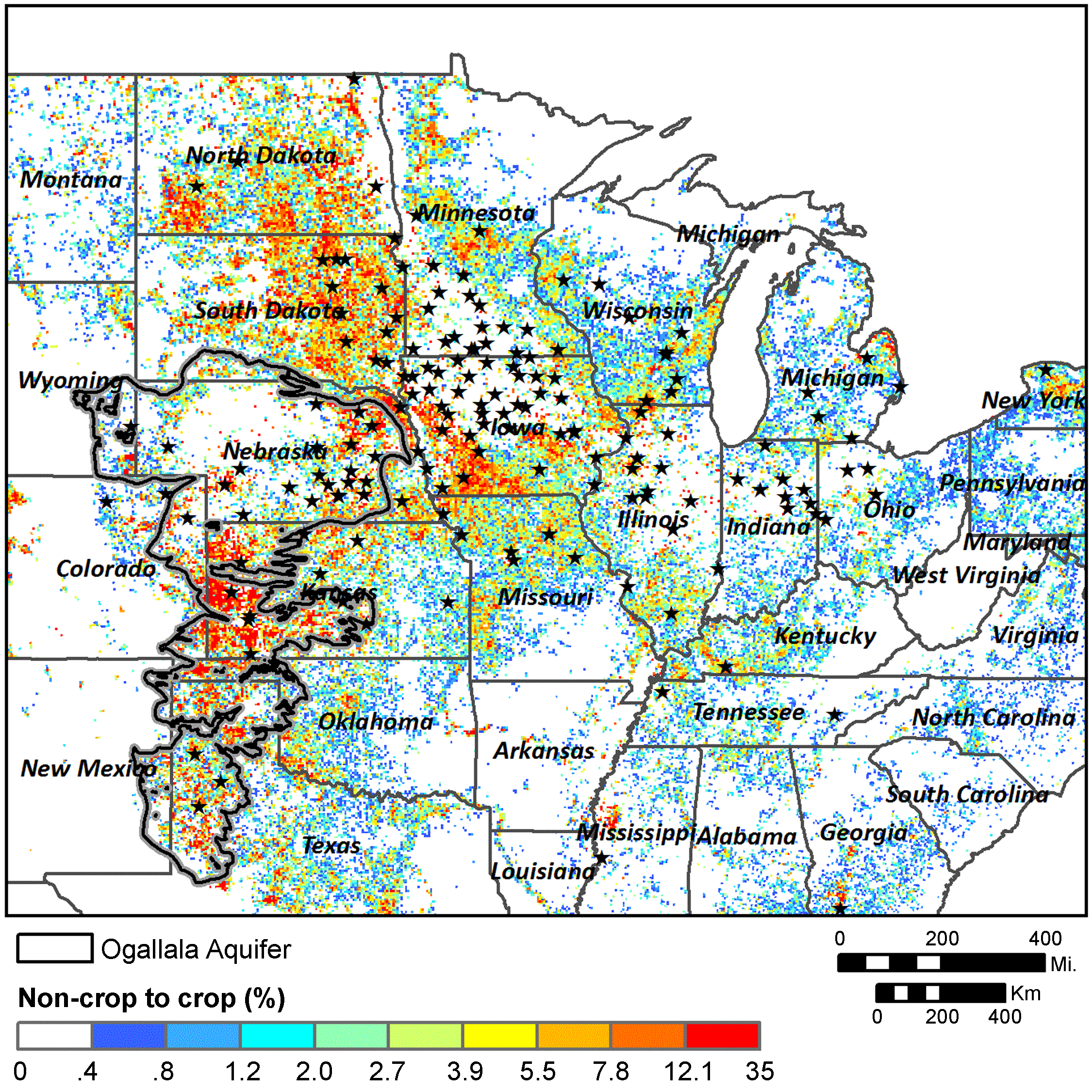 Standard image High-resolution imageAlong the Ogallala Aquifer, elevated conversion rates in western Kansas, Oklahoma and Texas coincided with areas experiencing groundwater depletion rates ranging from 5%–20% per decade [16]. In western Kansas, where remnant shortgrass prairie is concentrated [23], conversion rates generally exceeded 12.1%, the most intense hotspot of change found (figure 7). Outside the Ogallala Aquifer and Corn Belt regions, cropland expansion surrounding isolated ethanol refineries was relatively localized, with the exception of western New York (figure 6(b)).