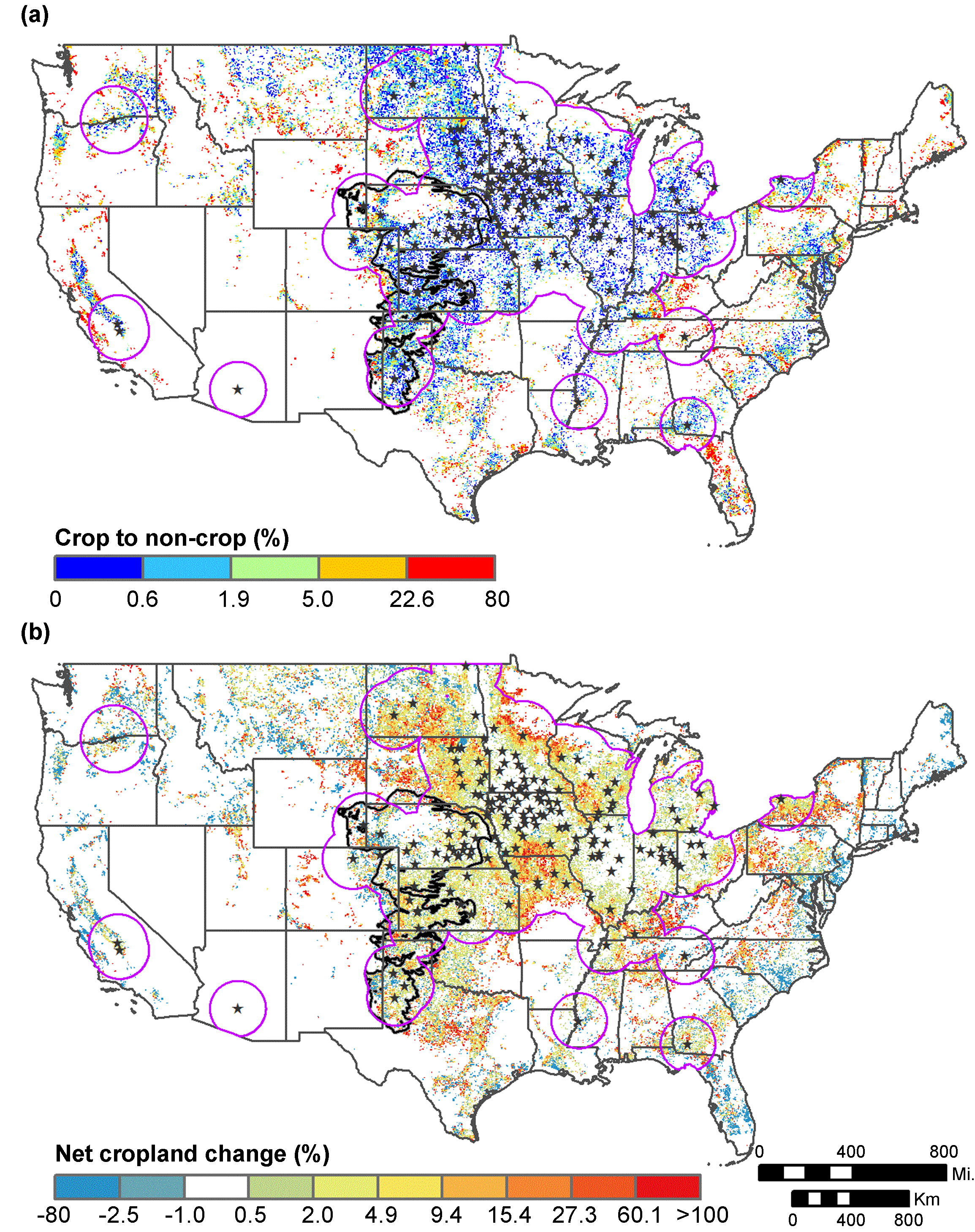Figure 8 (a) Cropland reversion rates (2008–2012). Legend values are quintiles of non-zero rates. (b) Net cropland change rates (2008–2012). Legend values are deciles of non-zero rates. Both rates normalized by 2008 cropland area. Spatial resolution 3.5 miles.