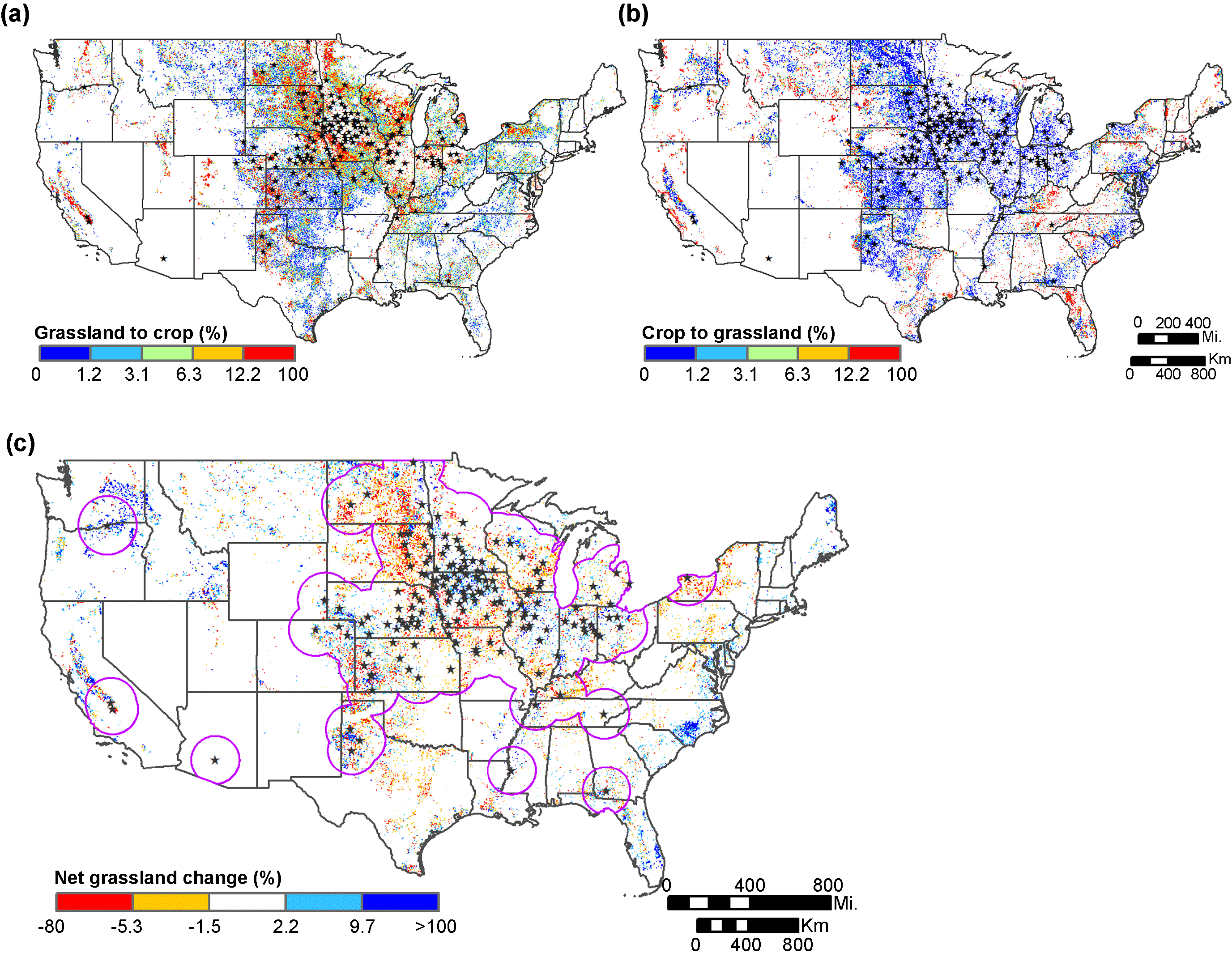 Figure 9 Rates of LCLUC involving the generalized grassland cover class (2008–2012) (a) Conversion of arable grassland, normalized by arable grassland area in 2008. (b) Reversion of cropland to grassland, normalized by 2008 cropland area. (c) Net grassland change (reversion minus conversion) normalized by 2008 arable grassland area. Legend values are quintiles of non-zero rates. Spatial resolution 3.5 miles.