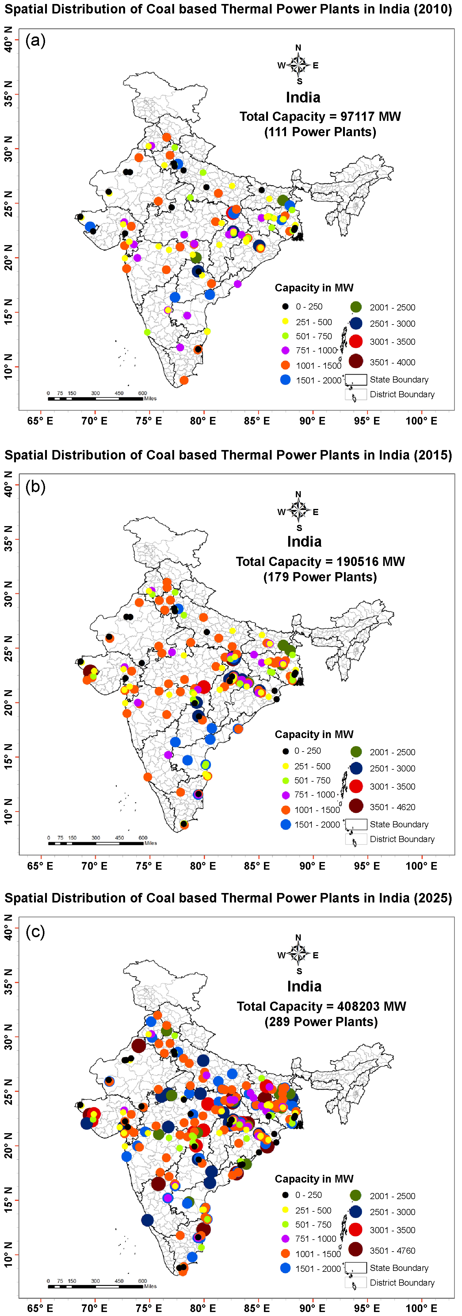 Standard image High-resolution imageFigure 2. Spatial distribution of thermal power plants and their capacity in India in (a) 2010, (b) 2015, (c) 2025.