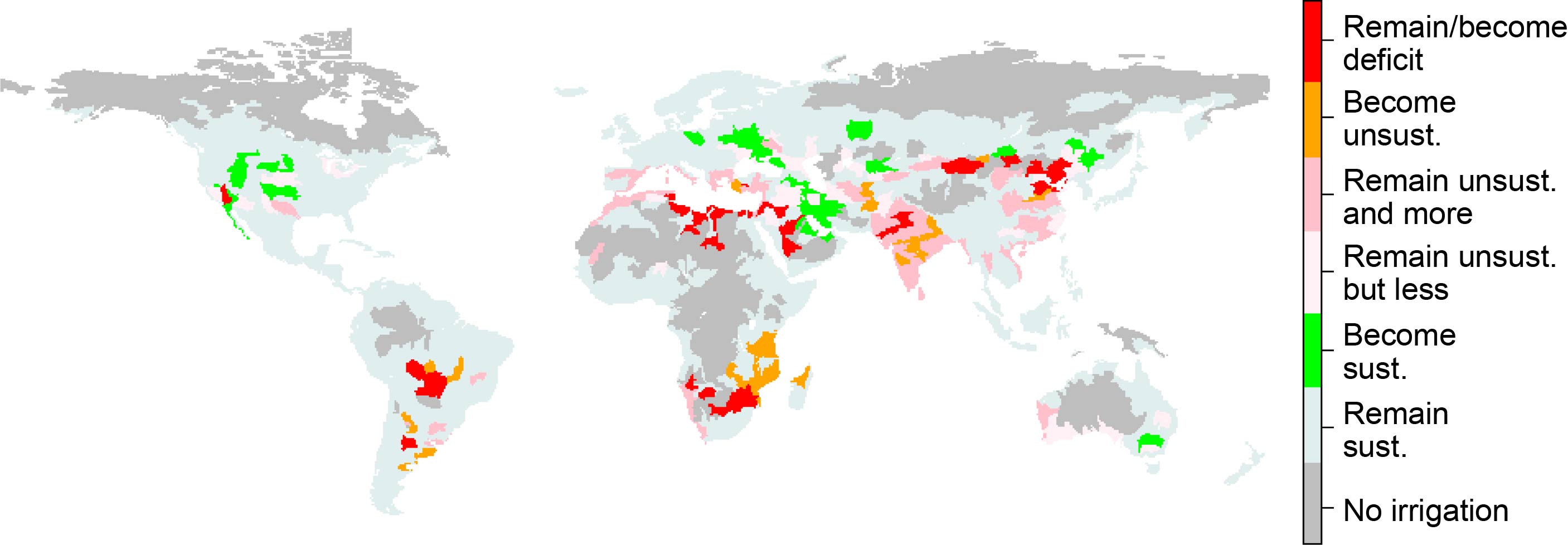 What is the outlook of irrigation vulnerability in 2050 after taking into account the factors that affect irrigation water demand and supply? A comparison of the 2050 and 2006 vulnerability indices is shown in figure 1. Future irrigation is predicted to be more vulnerable in South Asia, Central China, the Mediterranean region, the Pampas, and Southeast Africa. Two cases are of particular concern from a sustainability point of view: sub-basins where the index value was originally below 0.2 but rises above the threshold ('become unsustainable'), and the already irrigation-stressed sub-basins that will consume an even larger share of the irrigation water supply in the future ('remain unsustainable and more'). There are also regions where irrigation is currently unsustainable, but is projected to become more sustainable in the future. These regions, mainly the Central US, Iran, parts of East Europe, Northeast China and Southern Australia, experience higher rainfall under the RCP 8.5 climate scenario, exceeding the increase in consumptive irrigation. Again, these regions can be classified into two groups: the sub-basins that suffer from vulnerable irrigation today but will not in 2050 ('become sustainable'), and the sub-basins that remain vulnerable but wherein the index falls in the coming decades ('remain unsustainable but less').