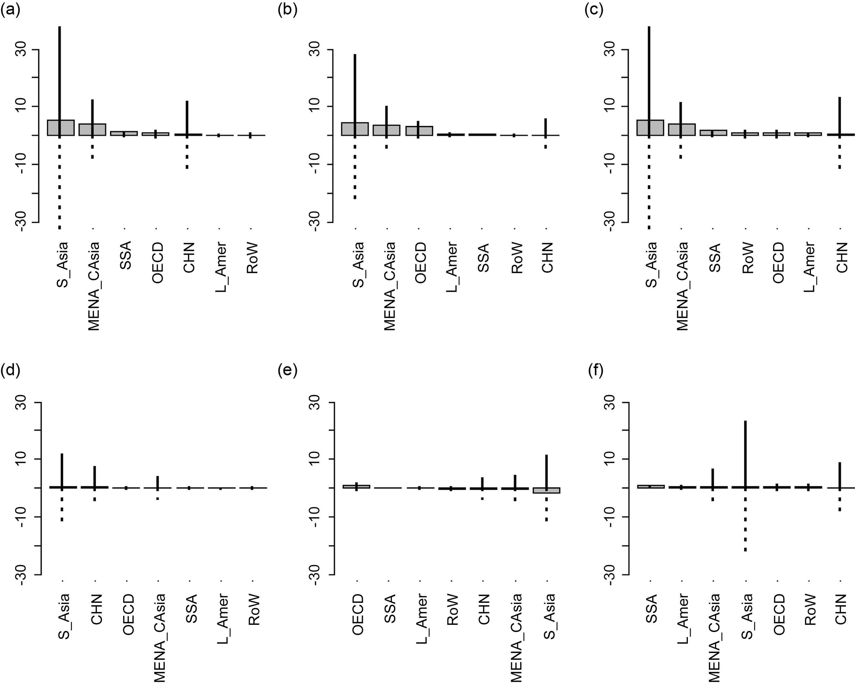 Standard image High-resolution imageFigure 3. Regional cropland area change (unit: million hectares). The top panel shows the results of equal total factor productivity (TFP) growth interacted with (a) business-as-usual (BAU), (b) inter-basin hydrological transfers (IBT), and (c) integrated market (INT). The global net cropland changes are 12.73, 11.52, and 14.32 million hectares, respectively. Bottom panel shows the results of faster TFP growth interacted with (d) BAU, (e) IBT, and (f) INT. The corresponding areas are 1.43, −1.24, and 3.88 million hectares. Net area change and the change of rainfed and irrigated cropland are represented by the bars, solid lines and dotted lines, respectively.