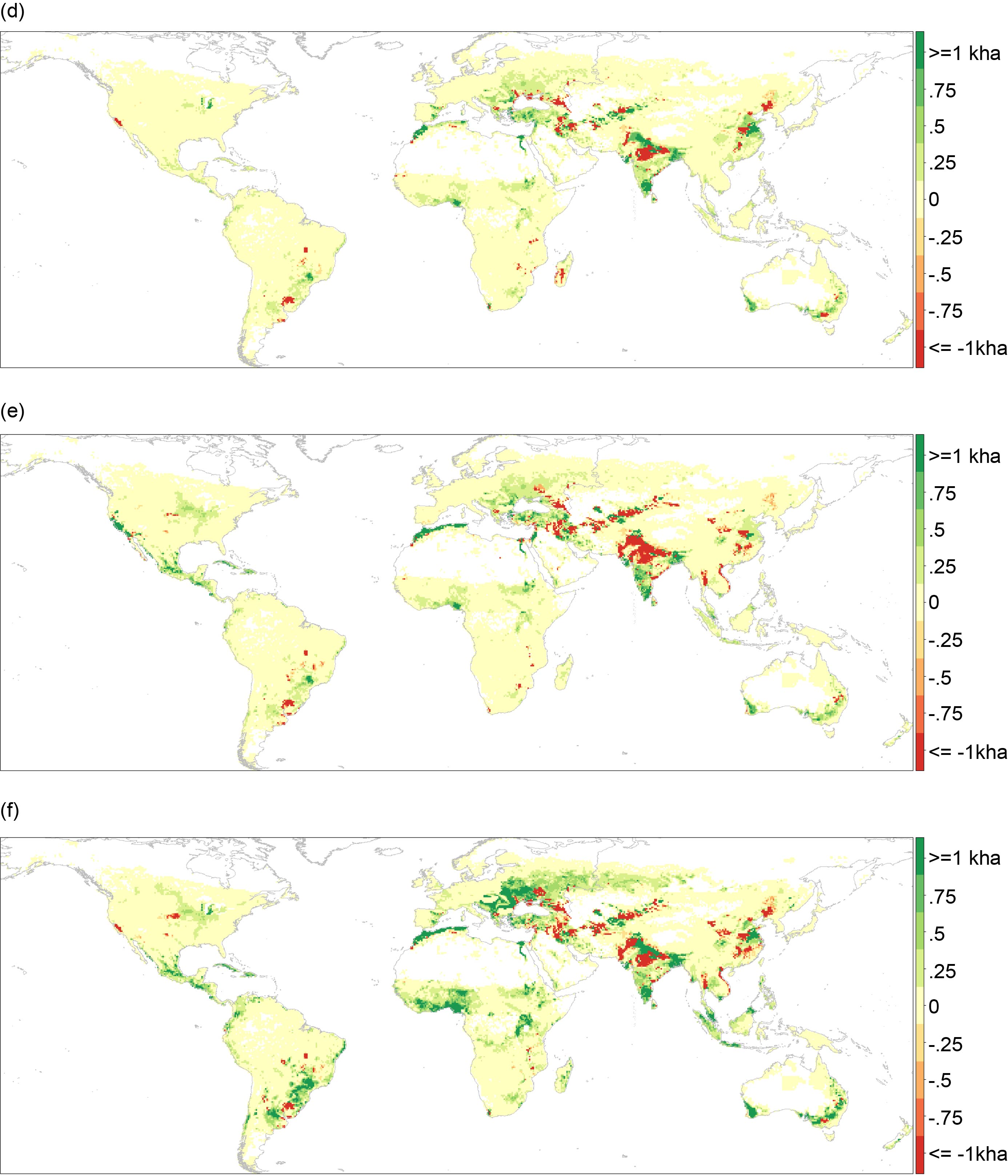 Standard image High-resolution imageFigure 4. Net cropland area change at the 30 arc-min grid-cell level (unit: thousand hectares). Sub-figures show the changes when equal total factor productivity (TFP) growth is interacted with (a) business-as-usual (BAU), (b) inter-basin hydrological transfers (IBT), and (c) integrated market (INT), as well as the changes when faster TFP growth interacted with (d) BAU, (e) IBT, and (f) INT. Global net cropland changes are 12.73, 11.52, 14.32, 1.43, −1.24, and 3.88 million hectares, respectively. See figure S7 for separate maps of irrigated and rainfed cropland area change.