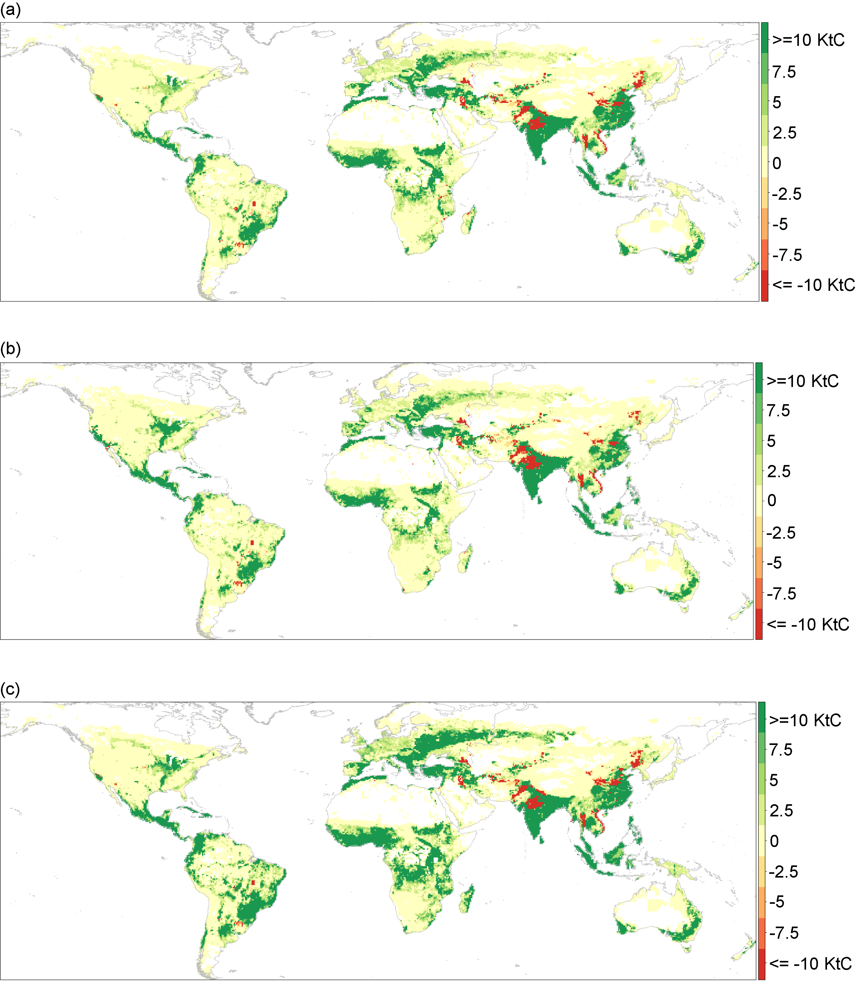 Standard image High-resolution imageThese fine-scale maps allow for more precise assessment of potential carbon emissions from land use change. Carbon emissions at each half-degree grid-cell are computed by multiplying net cropland area change (in ha) with carbon stock (in C ha−1) at the same resolution. According to West et al (2010), conversion to cropland corresponds to negative carbon sequestration (i.e. emissions). Therefore, net cropland expansion in figure 4 translates into net carbon emissions in figure 5. Some high and medium-high carbon stock hotspots in West et al (2010)'s map such as the West African coast, Southern Brazil, Southern and Eastern China, and India experience significant net cropland expansion in our results, contributing most to the total carbon emission change (see figure S8 for a Spearman correlation plot between grid-cell level carbon stock factor and net cropland area change). Under the no adaptation, equal irrigated TFP growth scenario, carbon emissions caused by restricted unsustainable irrigation increases by 0.871 GtC, which amounts to an additional 9% of global carbon emissions in 2014. This amount is attributed solely to the land use change caused by imposing sustainability constraint to the 2050 baseline, but not to any area change between 2006 and 2050 baseline. Implications for CH4 and N2O are not examined.