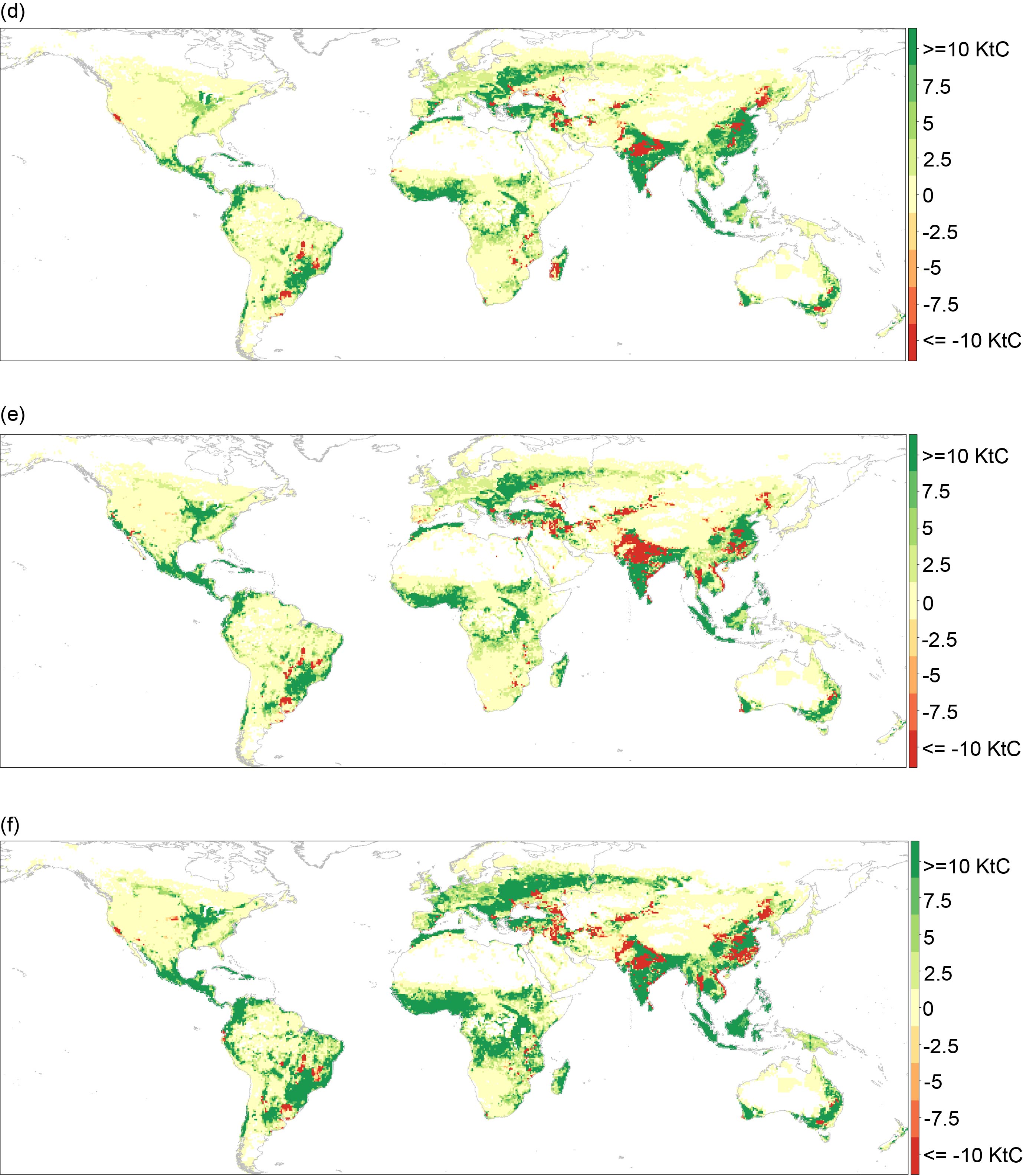 Standard image High-resolution imageFigure 5. Net carbon emissions at the 30 arc-min grid-cell level (unit: thousand metric tonnes of carbon). Sub-figures show the changes when equal total factor productivity (TFP) growth is interacted with (a) business-as-usual (BAU), (b) inter-basin hydrological transfers (IBT), and (c) integrated market (INT), as well as the changes when faster TFP growth interacted with (d) BAU, (e) IBT, and (f) INT. Global net changes in carbon emissions are 0.871, 0.826, 1.025, 0.180, 0.053, and 0.464 gigatons of carbon (GtC), respectively.