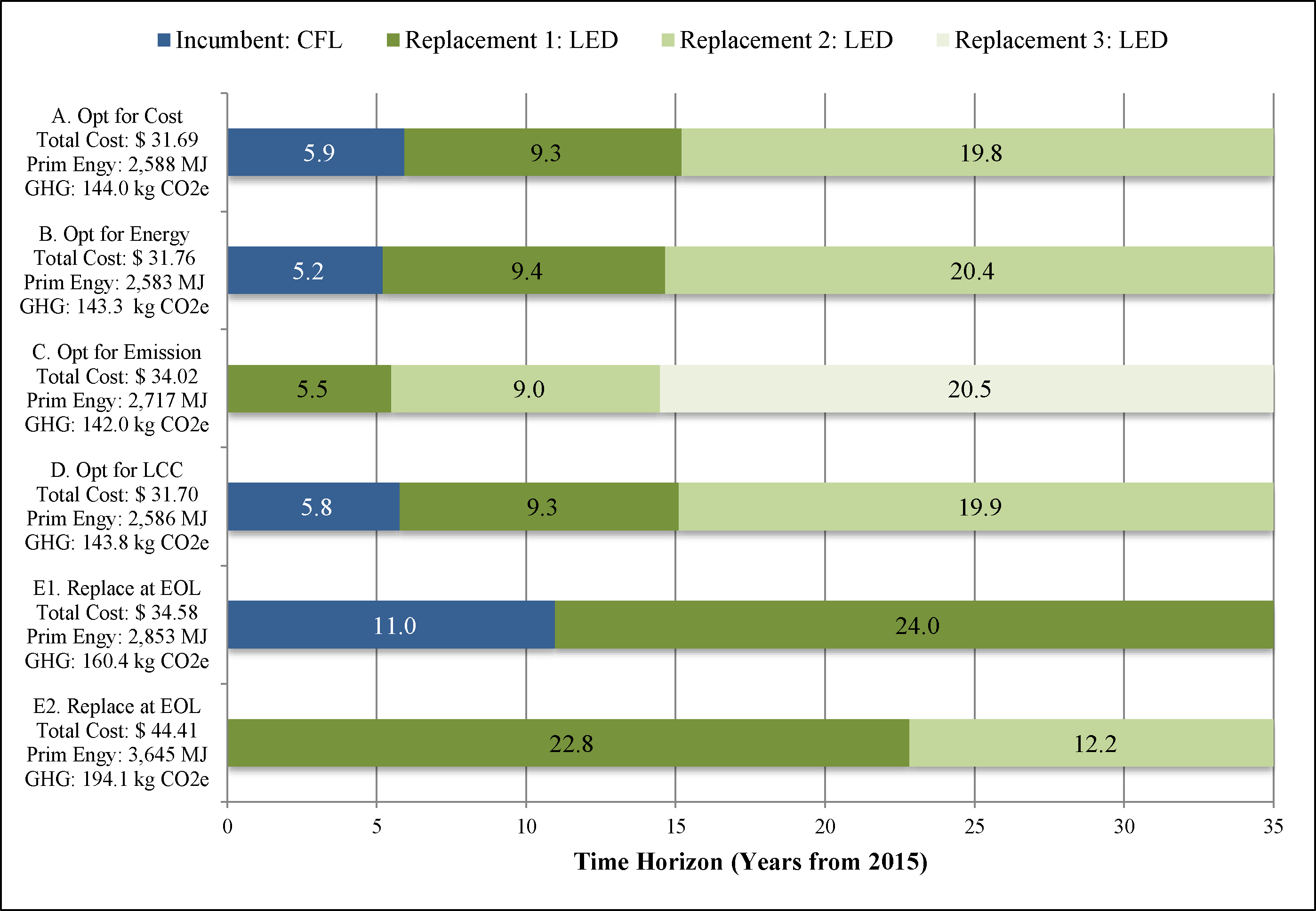 Figure 2 presents the optimized replacement policies for Case 1 at 3 HOU under different objectives: (A) Cost, (B) Energy, (C) Emissions, and (D) LCC. For all objectives, the optimal policies occur under the upgrade scenario where l2 = CFL and l3 = LED. Note that the initial lamp type does not affect the results since it is replaced immediately at the start of the time horizon. For comparison, two burnout replacement policies—E1 (an optimized solution where a CFL is purchased and later upgraded to an LED) and E2 (a suboptimal solution where an LED is purchased from the start) are also presented. Figure 3 shows a breakdown of the LCC-optimized policy (D) per individual lamp contribution.