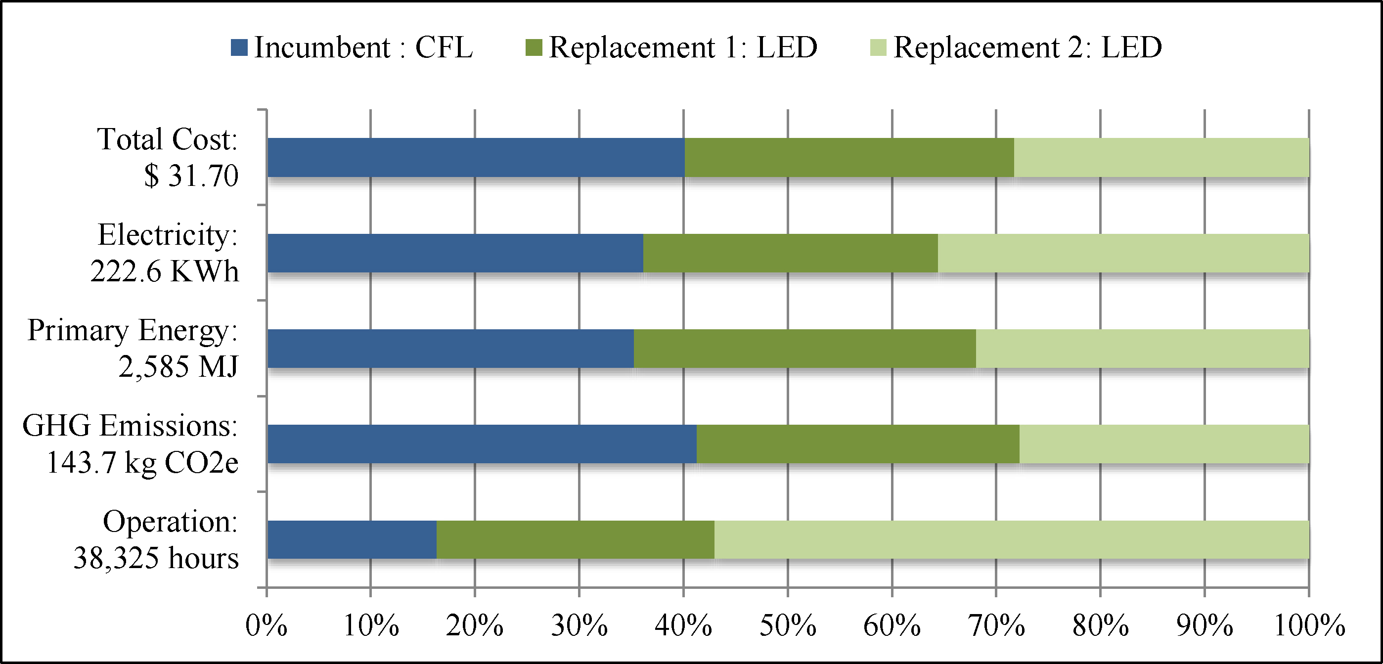 A breakdown of the LCC-optimized policy (D) in figure 3 shows that the CFL contributes the least lumen-hours but the most in Cost, electricity consumption, Energy, and Emissions. However, the CFL provides both energy and cost savings overall by allowing for the adoption of lower cost and more energy-efficient LED lamps later. This is also supported by the comparison of E1 and E2 in figure 2. In addition, it is not recommended to keep any of the lamps to the end of their rated lifetime (burnout), as doing so would increase the total life cycle impacts by 9%–41%. However, given that consumers generally do not replace their lamps until burnout, consumers may still achieve 84%–86% in life cycle impact savings by following E1, compared to using ILs only.
