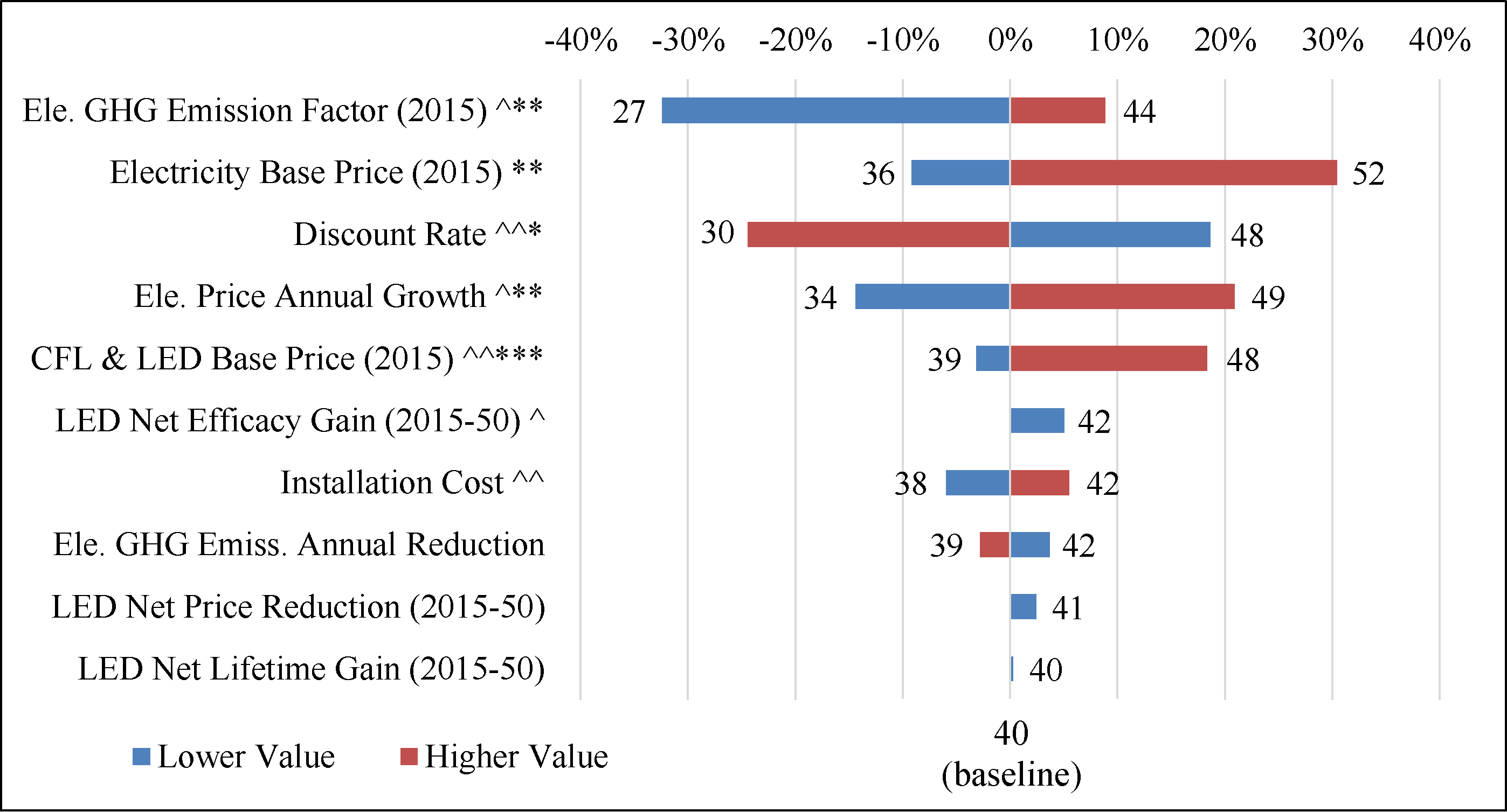 Figure 4. Change in LCC (objective value) per parameter value change. (Policy change indicators—^: change in replacement timing from lower value, ^^: change in total number of lamps used from lower value, ⁎: change in replacement timing from higher value, ⁎⁎: change in total number of lamps used from higher value, ⁎⁎⁎: change in type of first lamp purchased.)