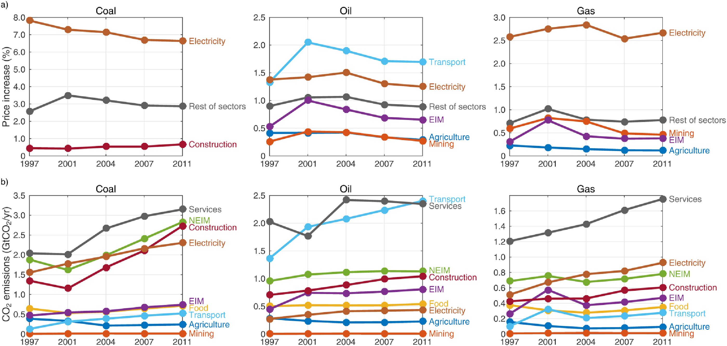 Figure 1. Assuming a global carbon price of 20$/tCO2, row (a) shows global price increases in sectors for multiple years by fossil fuel type (coal, oil, gas), and row (b) shows global emissions in sectors for multiple years by fossil fuel type. While (a) shows in what sectors prices will increase the most, (b) shows where the emissions occur. NEIM is non-energy intensive manufacturing, and EIM is energy intensive manufacturing.