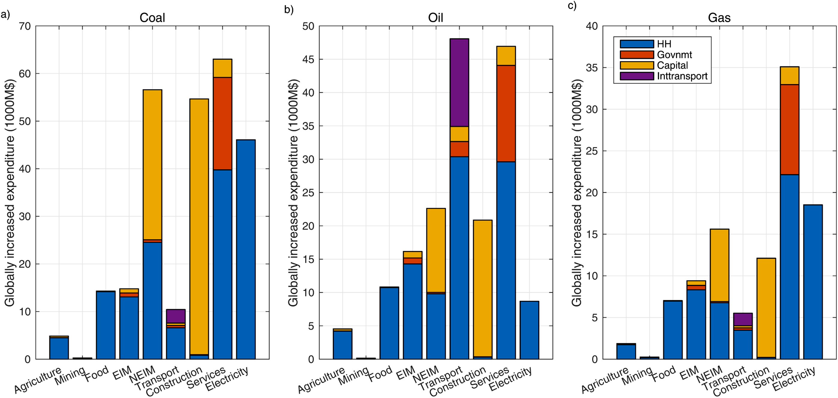 Figure 2. Globally increased expenditure by final demand categories for the year 2011 for a carbon price of 20$/tCO2 by fossil fuel type (coal, oil, gas). NEIM is non-energy intensive manufacturing, and EIM is energy intensive manufacturing.