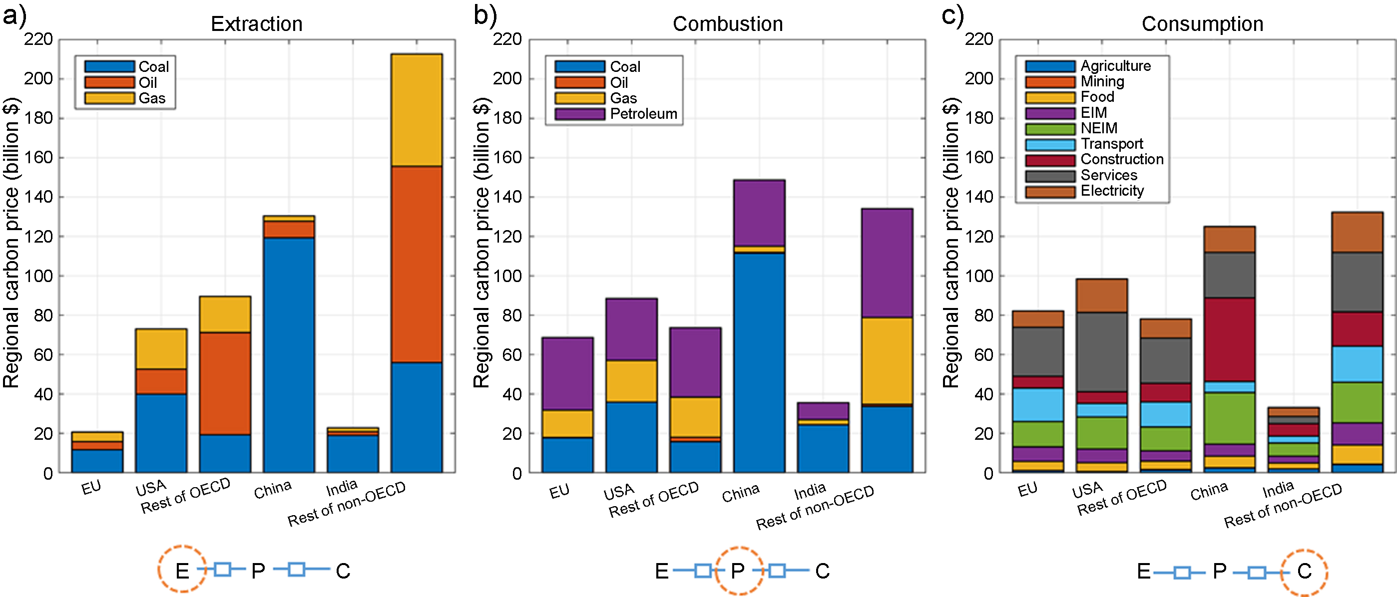 Standard image High-resolution imageFigure 3. Regional absolute carbon price on different points along the supply-chain: (a) extraction, (b) production and (c) consumption for the year 2011. The bars are divided into sources of fossil fuels (a) and (b) or sector's use of fossil fuels (c). The dashed red circle on the bottom legend indicates where along the supply-chain the carbon price is implemented. NEIM is non-energy intensive manufacturing, and EIM is energy intensive manufacturing.