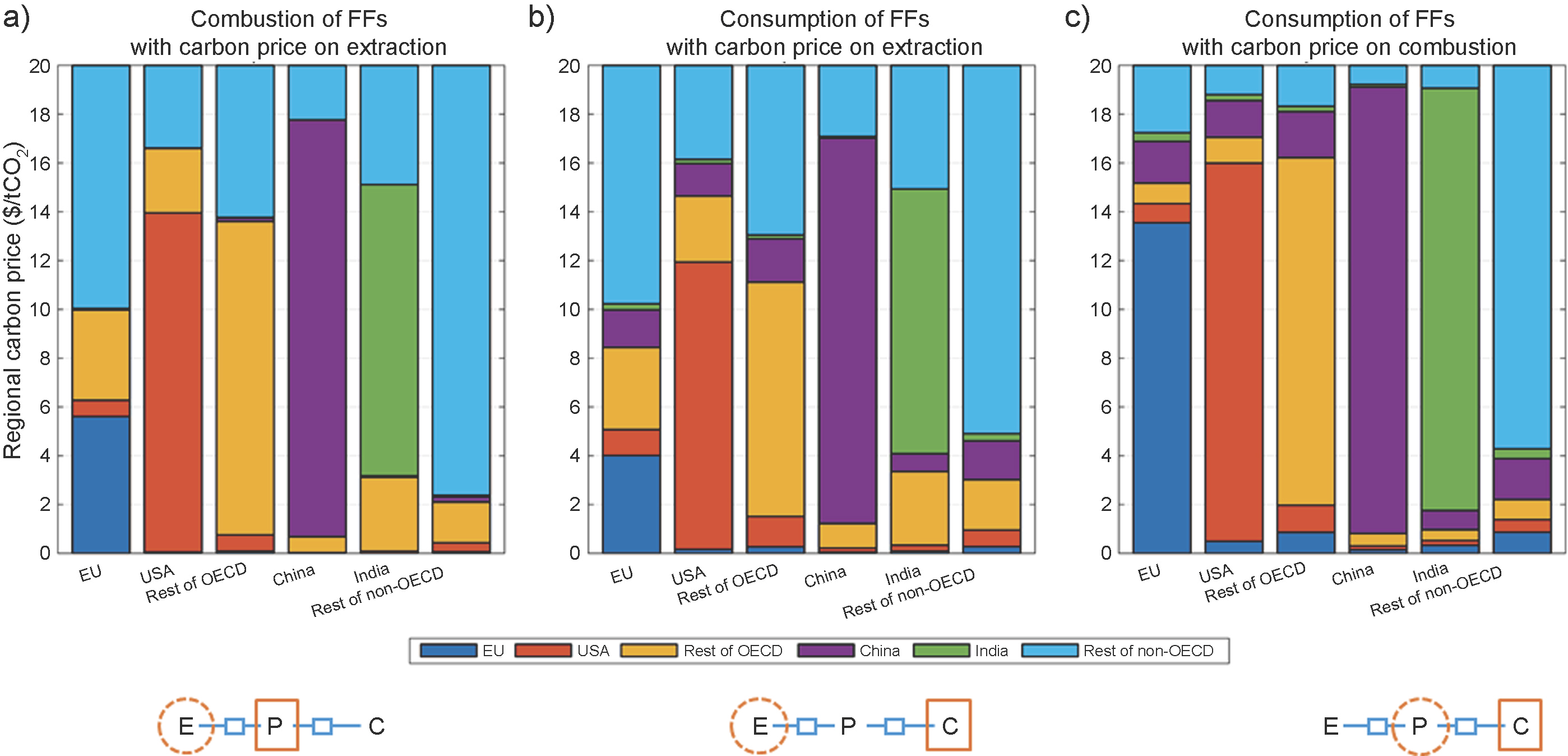 To highlight the distribution of carbon price according to global trade, the carbon price must be implemented higher upstream than where the emissions accounting takes place, thus leaving three possible cases (figure 4): (a) carbon price on extraction and using production emissions, (b) carbon price on extraction and using consumption emissions, and (c) carbon price on production emissions and using consumption emissions. We compare the 'effective' carbon price in the nations by dividing the increased expenditure by emissions according to the accounting system (production or consumption emissions), thus getting the actual carbon price paid by the nations consumers. In all cases this adds to 20$/tCO2, but the disaggregation allows analysis of where the price originates. The application of a uniform carbon price with a different price would simply change the total, not the distribution.