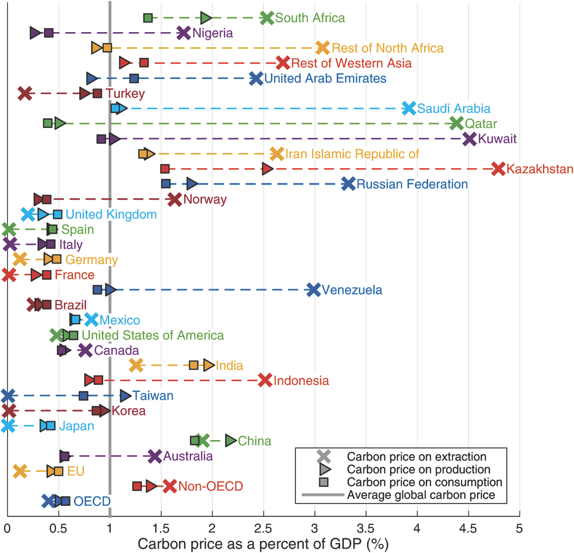 Since nations extract, produce and consume at different rates, and with different technologies, the costs for the consumers or government revenue from a carbon price relative to gross domestic product (GDP) of the economies is different (figure 5). A global carbon price of 20$/tCO2 would represent about 1% of global GDP in 2011 (grey line in figure 5). This is higher than the revenue raised from the EU ETS at its peak (2008–2012 prices; Pezzey and Jotzo (2013)). The average of the carbon on extraction, production and consumption emissions for all nations sum to the same global total, but the national numbers vary significantly.