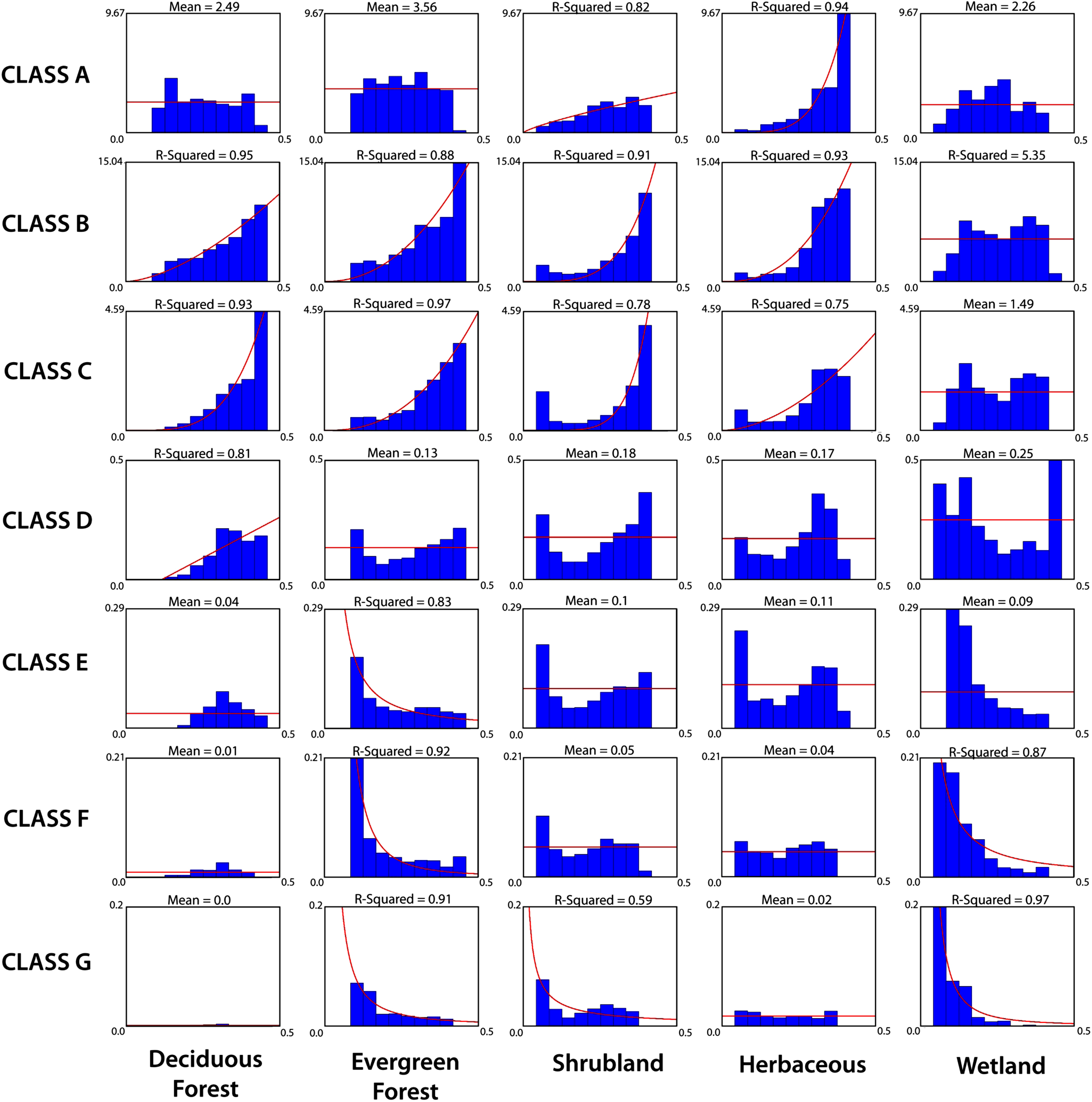 This produced a distribution of fire occurrence, visible in figure 1, and burned area as a function of soil moisture for each land cover class. These data were then binned by soil moisture ranges to calculate average fire occurrence and burned area values over each range. These distributions reveal the unique relationship in each land cover class between occurrence of wildfires of increasing size classification as a function of soil moisture state. These relationships were then individually modeled by fitting an exponential or linear function depending on which resulted in a higher R2 value. If neither function's R2 surpassed 0.5, meaning pre-season soil moisture explains less than 50% of the variance in fire activity, mean number of fires and mean burned area were plotted instead. This methodology is displayed for fire occurrence in figure 2 for each land cover type and fire size class, and the same method was followed for burned area.