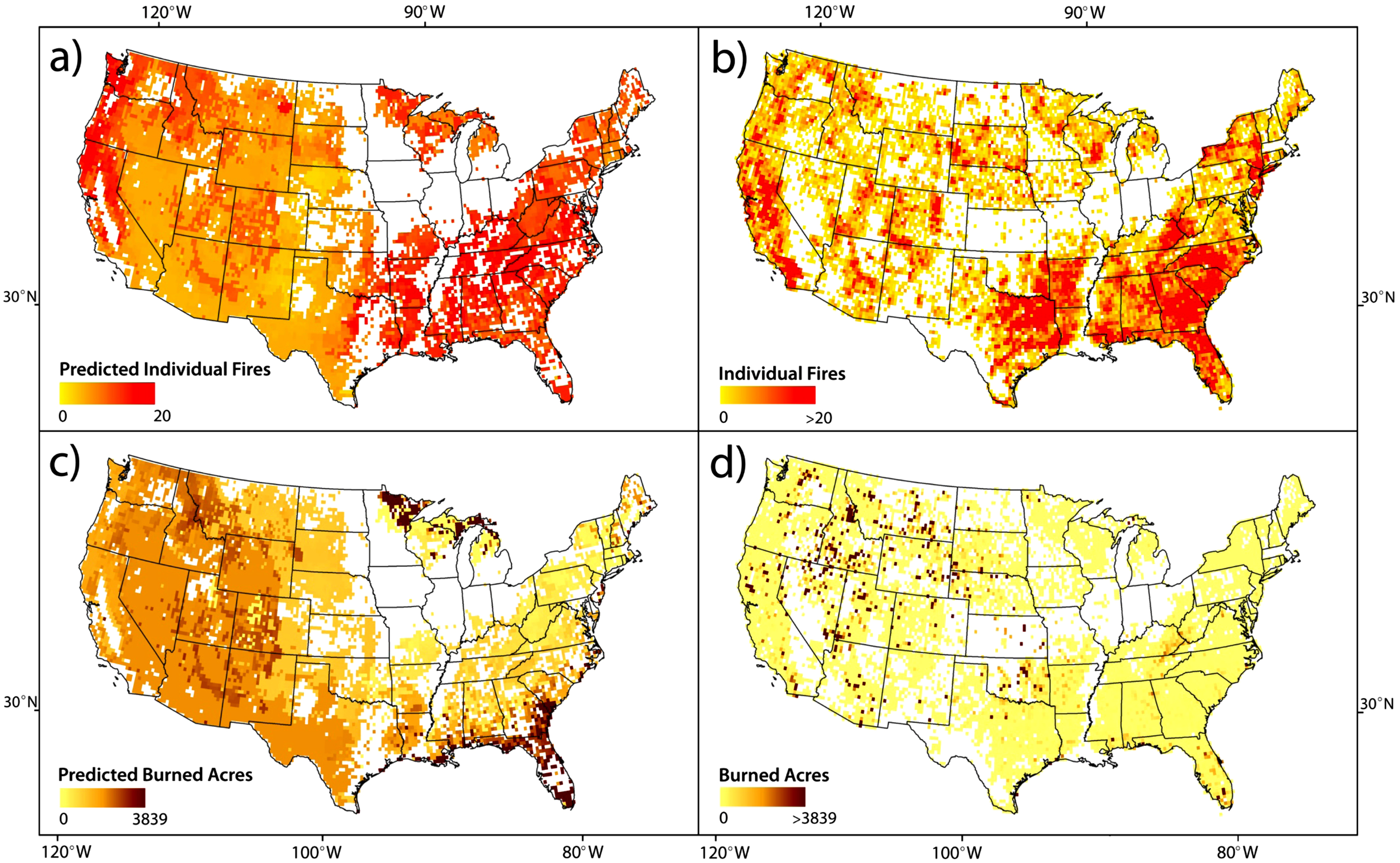 Figure 3. Predictive maps for (a) individual fires and (c) burned area to assess fire risk and potential from May 2012–April 2013. These predictive results are compared against the (b) actual fire distribution and (d) actual burned area for that year for validation.
