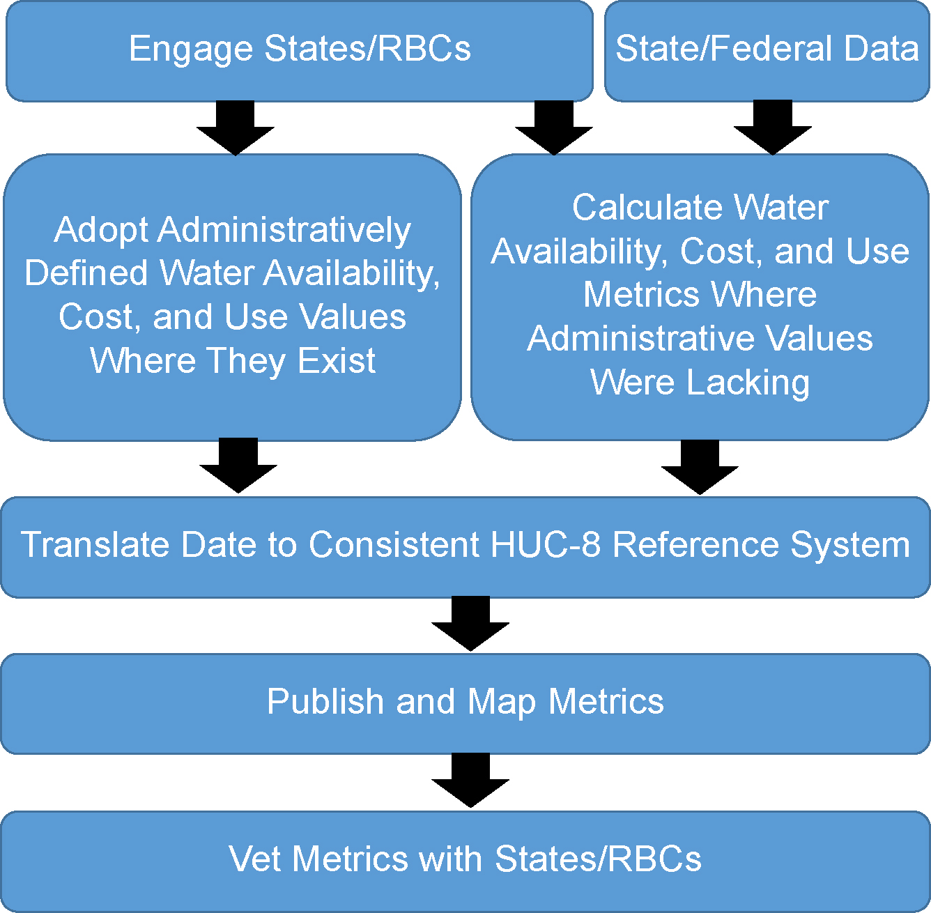 This compiled set of water metrics is unique thus providing an improved basis for planning. First, water metrics were developed with the direct assistance of regional water managers incorporating state/RBC administrative controls where they exist. Second, metrics were developed for multiple sources of water, including fresh and non-fresh sources, allowing tradeoffs to be drawn between alternative supplies. Third, available supplies were put in context of projected growth in water use. Fourth, metrics quantifying the relative cost to deliver water of potable quality were estimated, providing a rough measure of the substitutability of one source of water for another. Finally, all metrics were developed in a consistent manner and with a uniform set of data allowing comparisons at the eight digit HUC level across the contiguous United States.