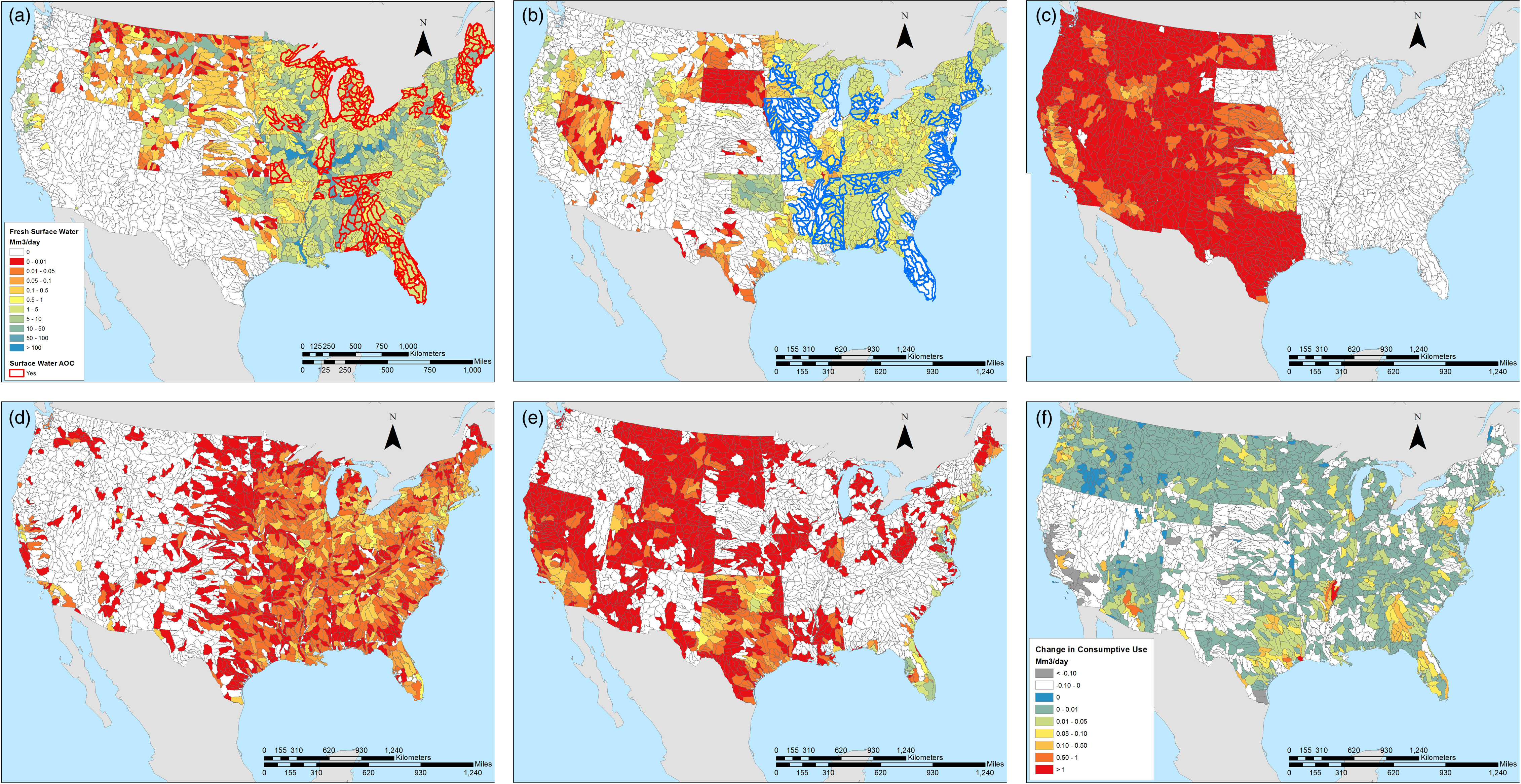 Standard image High-resolution imageFigure 2. Water availability mapped by eight digit HUC watershed for the contiguous United States. Mapped are (a) fresh surface water, (b) fresh groundwater, (c) appropriated water, (d) municipal wastewater, and (e) brackish groundwater. Outlined watersheds (red and blue) have been designated by eastern states/RBCs as areas of concern. Also mapped is the projected change in consumptive water use between 2010−2030 (f).