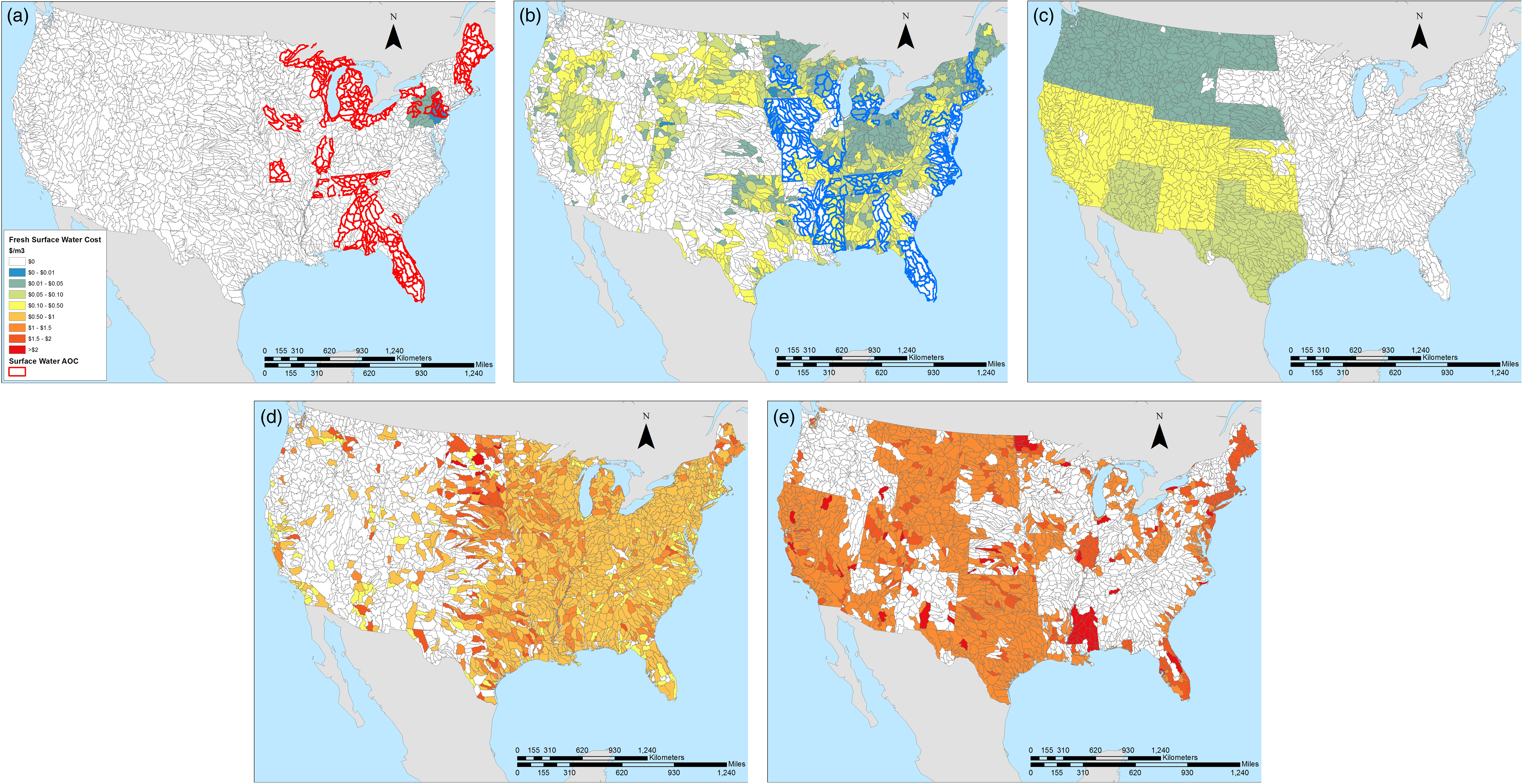 Figure 3. Water cost mapped by eight digit HUC watershed for the contiguous United States. Mapped are (a) fresh surface water, (b) fresh groundwater, (c) appropriated water, (d) municipal wastewater, and (e) brackish groundwater.
