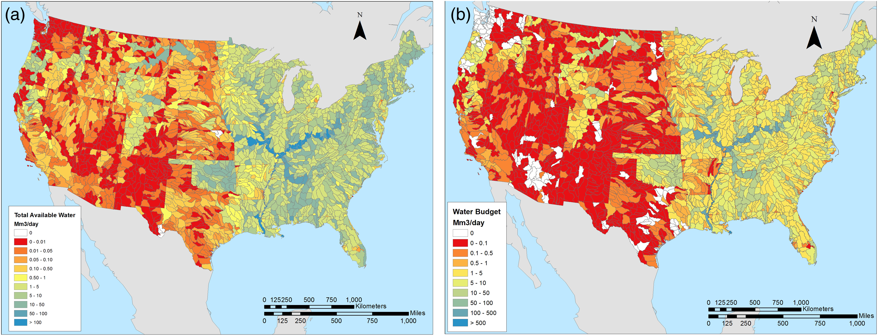 Figure 4. Total available water (a) mapped by eight digit HUC watershed for the contiguous United States, calculated by adding all water sources (figures 2(a)–(e)). Water budget for 2030 (b) calculated by subtracting projected change in water consumption (figure 2(f)) from total water availability (figure 4(a)).