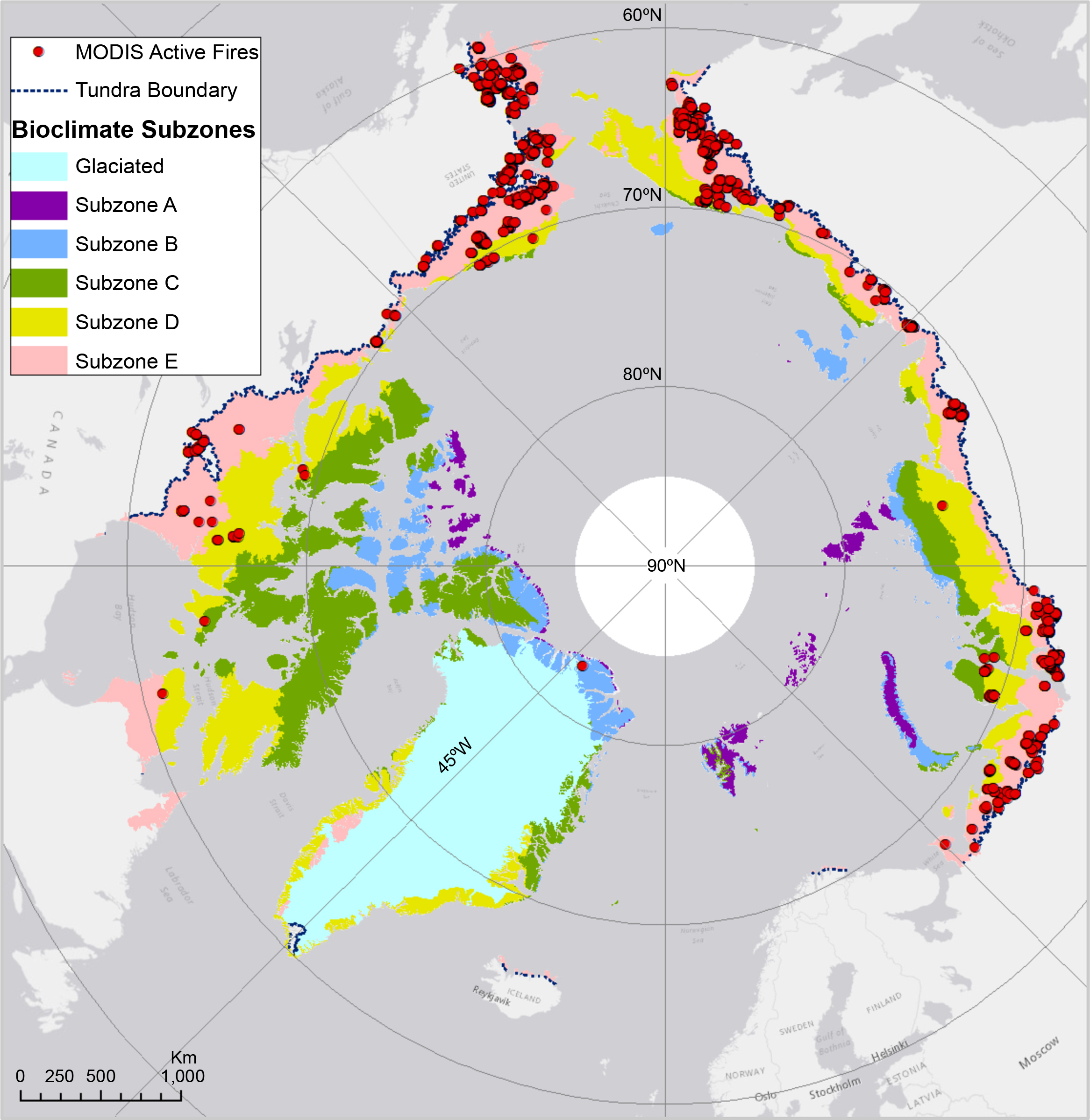 Figure 1. MODIS active fire pixels (2001–2015) in circumpolar Arctic tundra bioclimatic subzones (CAVM Team 2003, Walker et al 2005). Here, each fire pixel represents a temporal snapshot of ongoing wildfire activity which we characterized as a 'wildfire event'.