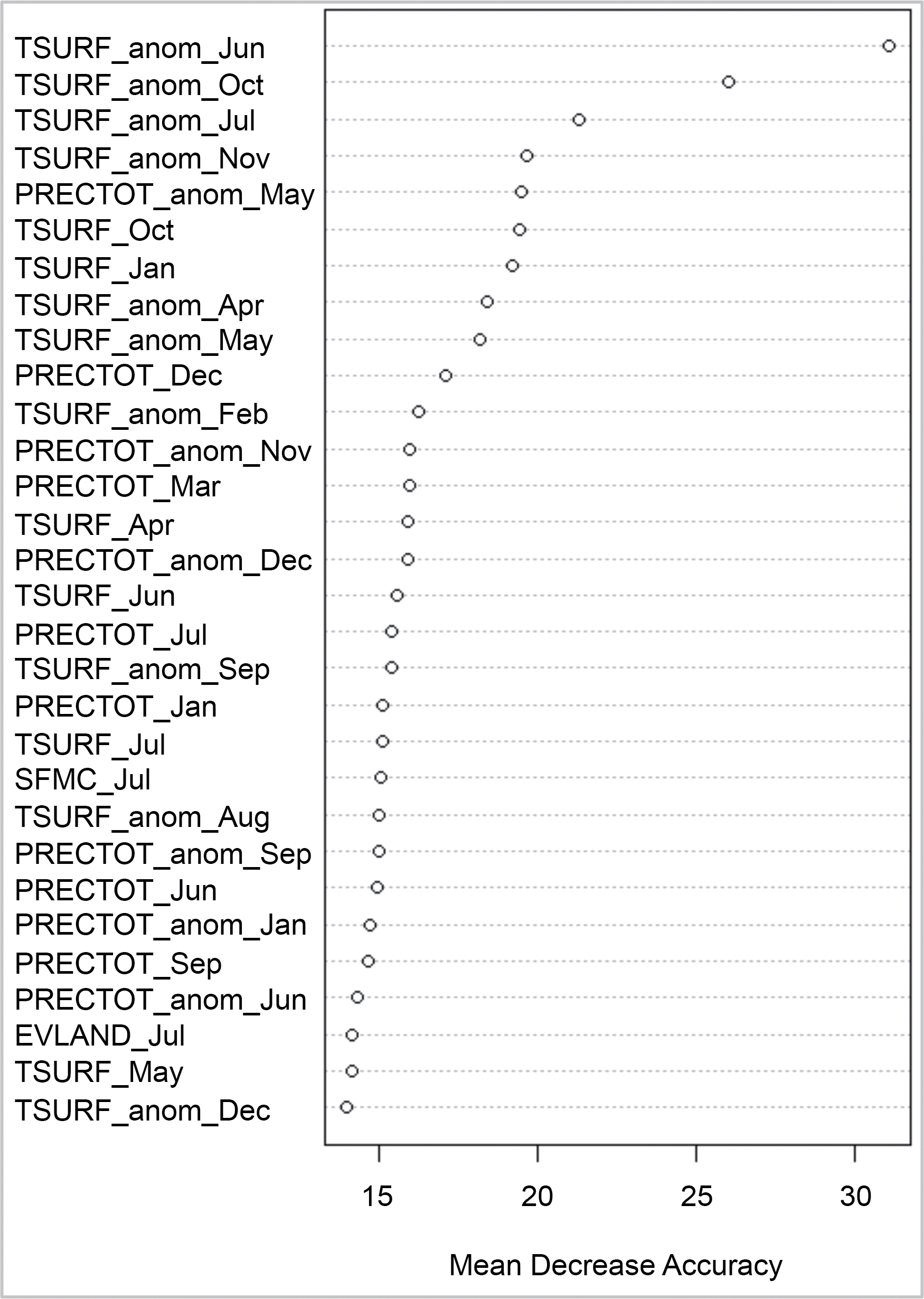 Figure 4. Random Forest-derived variable importance plot: important climate variables that determined tundra wildfire vs. no wildfire events between 2001 and 2015.