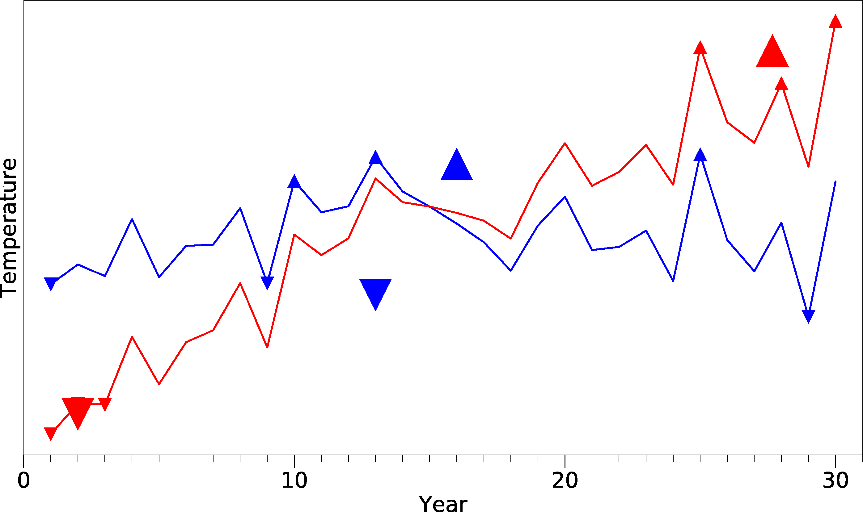 Figure 1. Schematic of the influence of a trend during a 30 year SWL epoch on the timing and average of temperature extremes. Blue (red) line is synthetic data without (with) a trend added. Small triangles pointing downward (upwards) indicate low (high) extremes, and the large triangles indicate the mean across the three individual points.